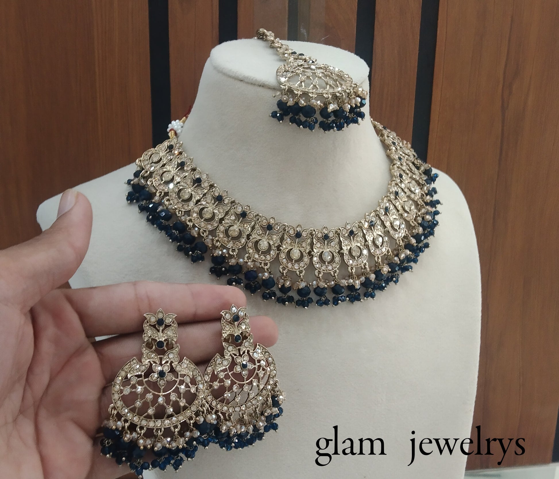 Antique Gold Blue Indian Bridal Isha Jewellery Necklace Set