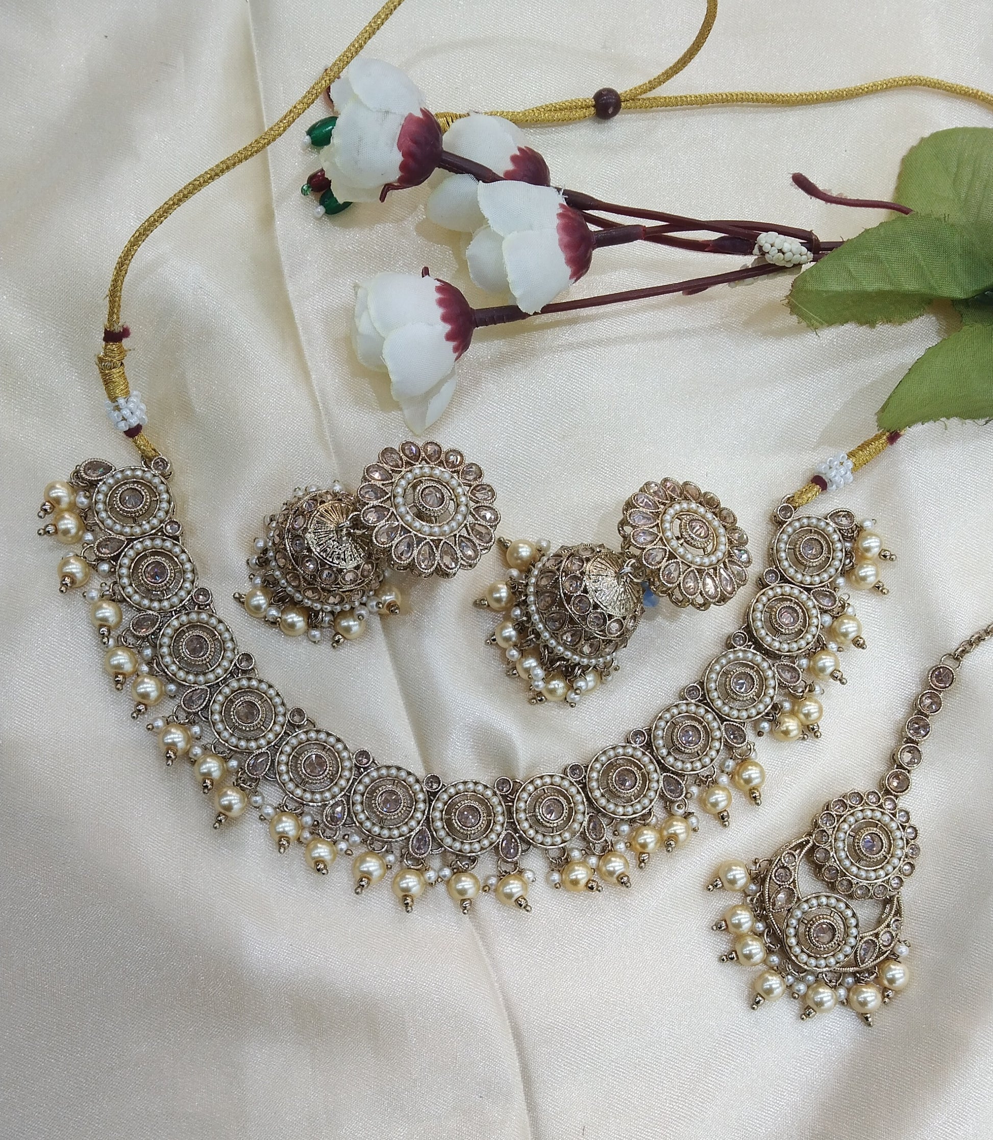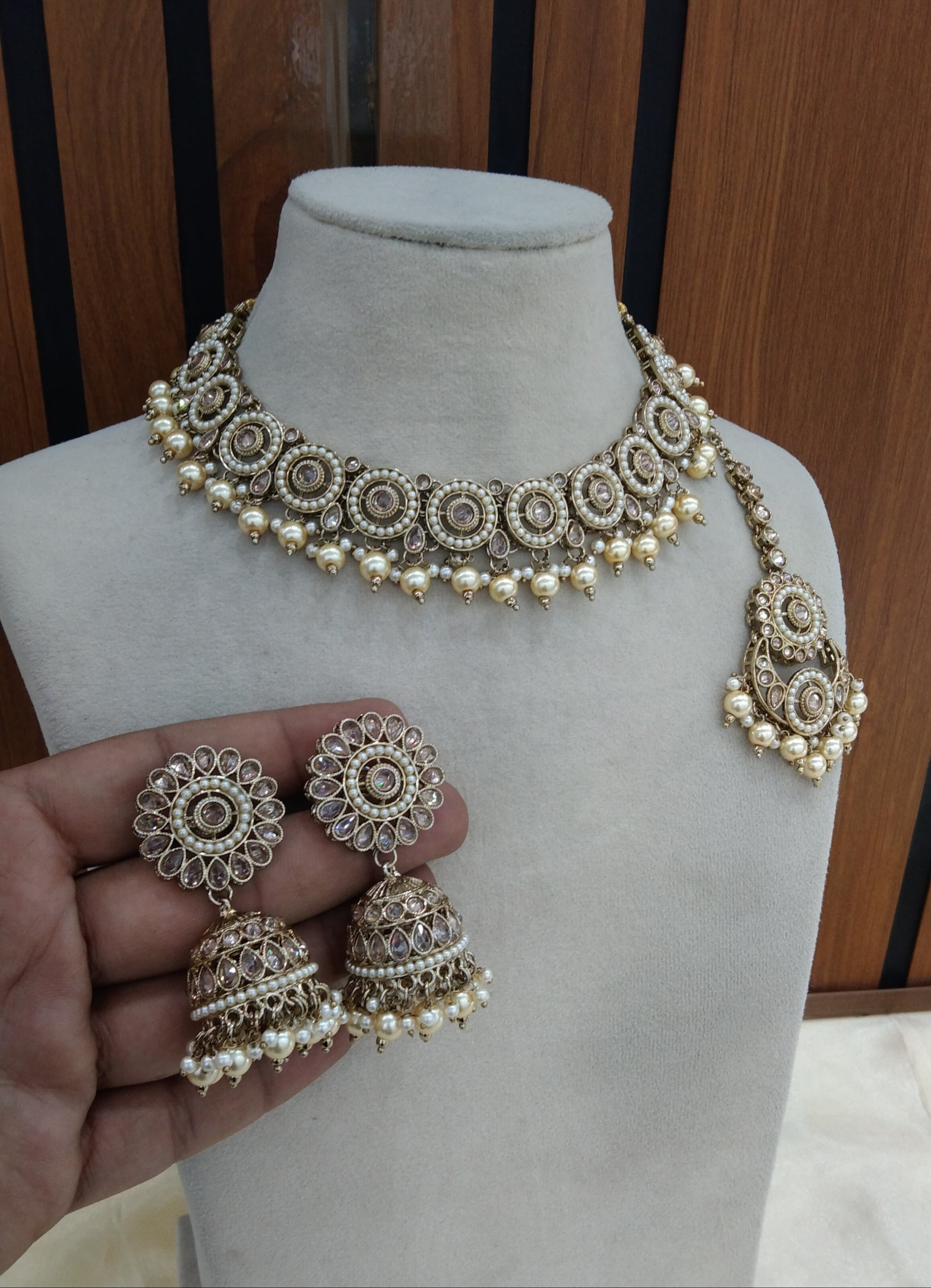 *Light weight gold choker necklace Set with earrings Tikka as shown in the pic.