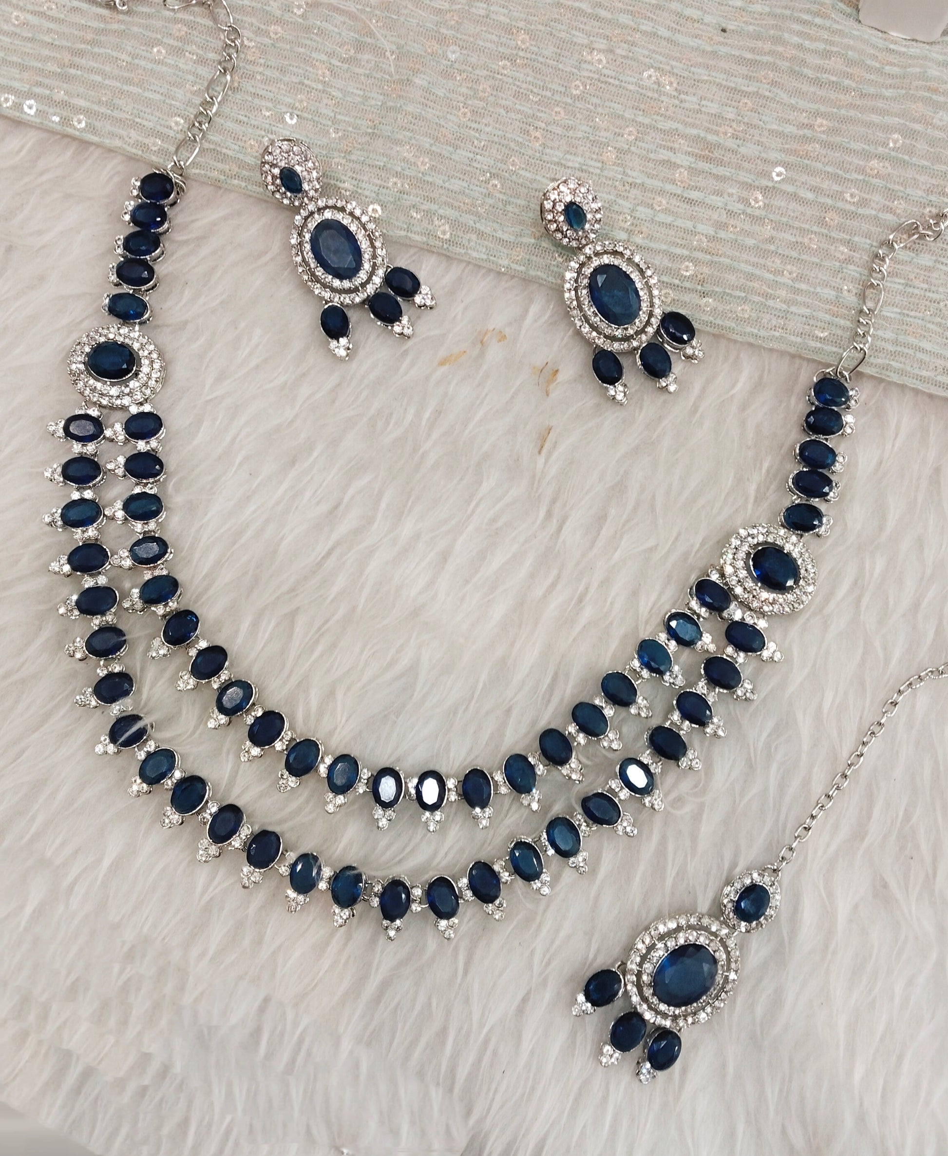 Blue Silver CZ Necklace Indian Jewellery Gajrup Set