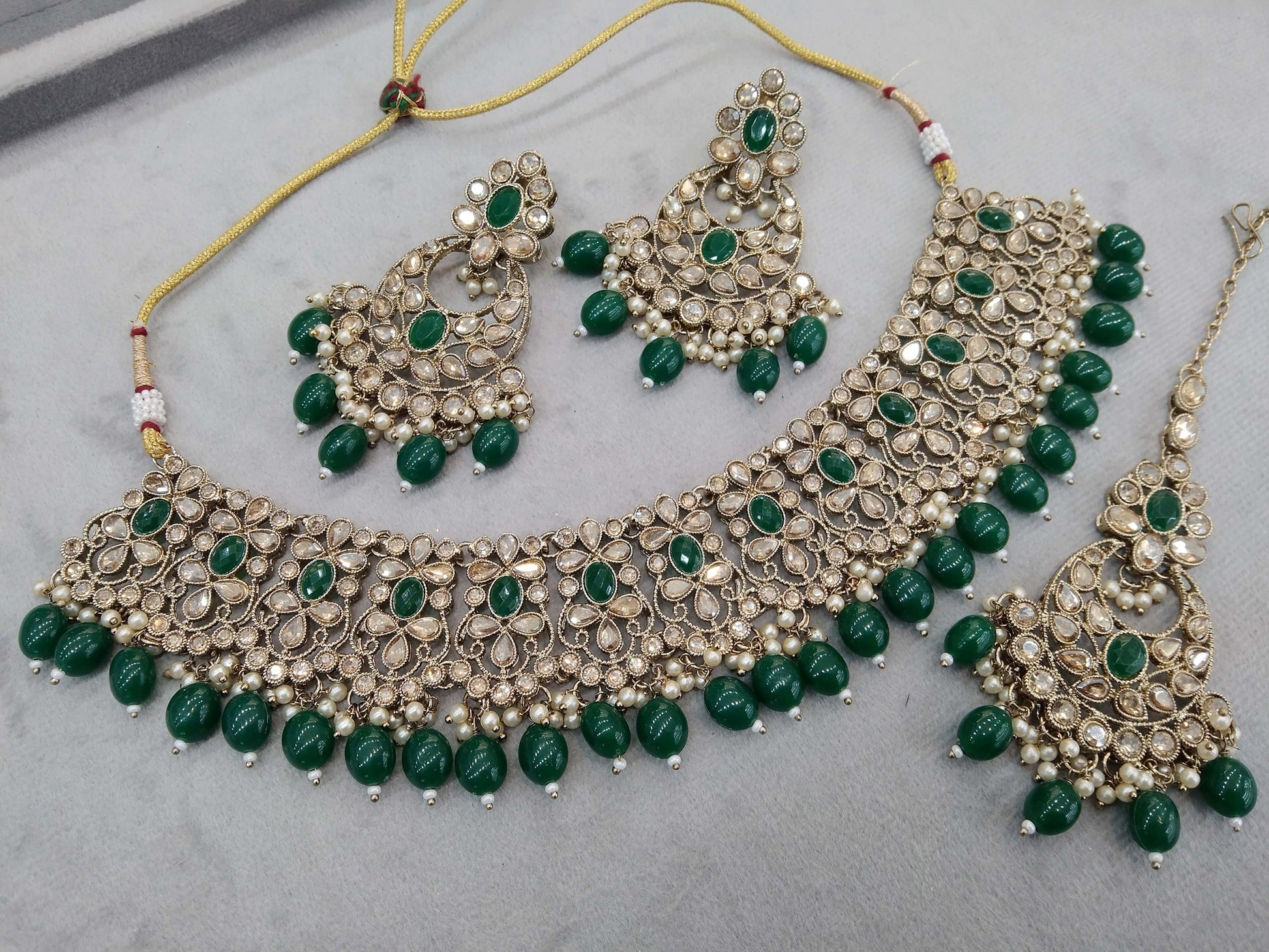Antique Gold Necklace Jewellery Set/ dark gold green necklace Indian oory jewellery set Online