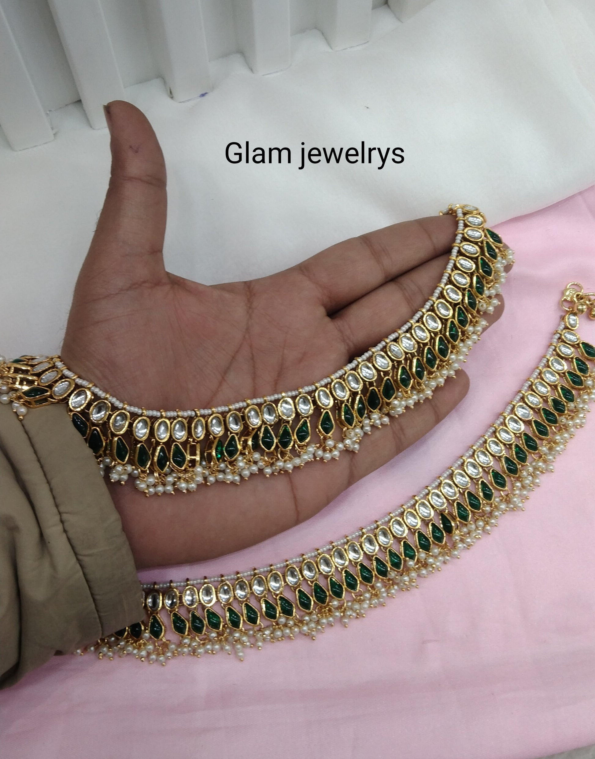 Gold Green Kundan Anklets Jhanjar Payal Indian Jewellery opti Set