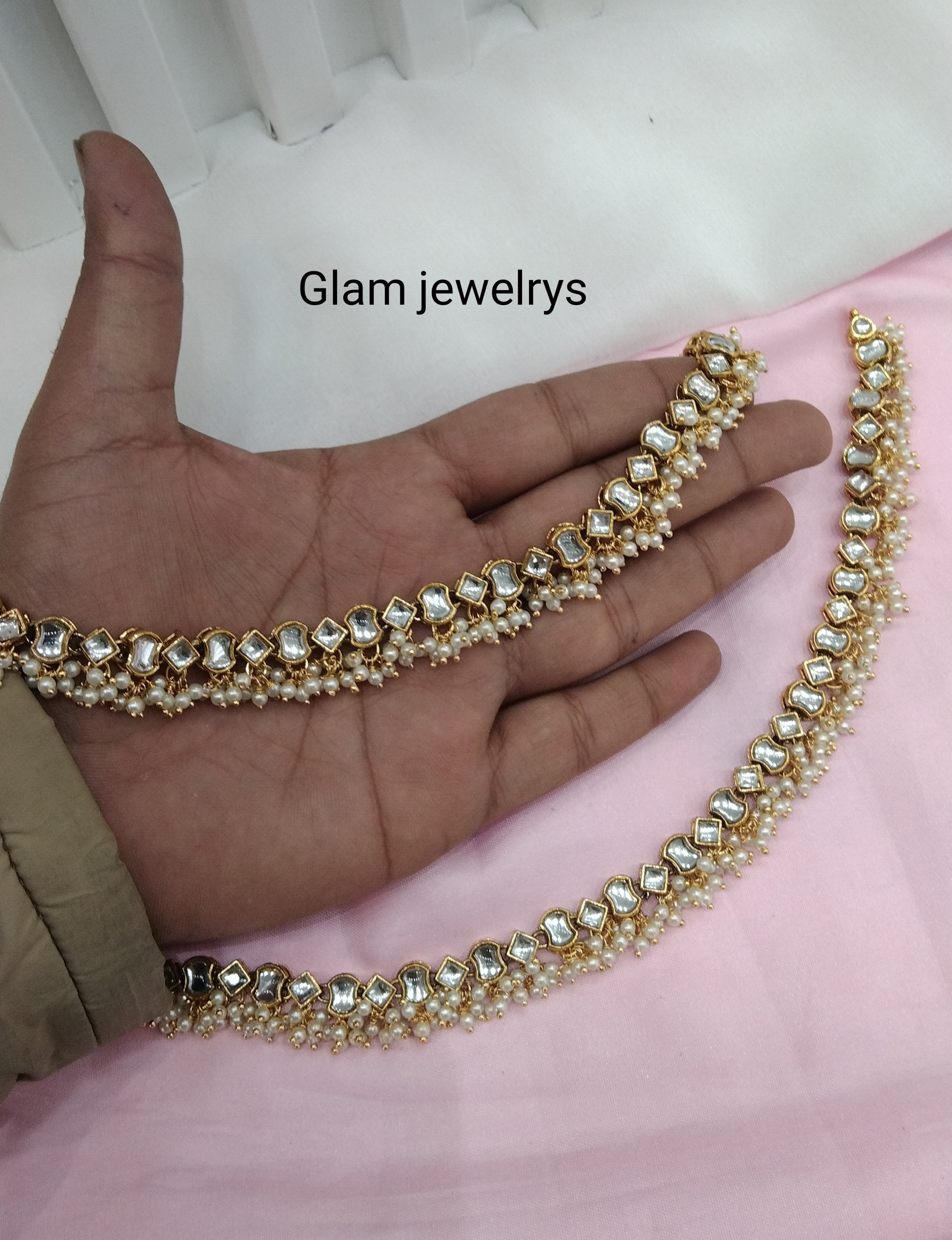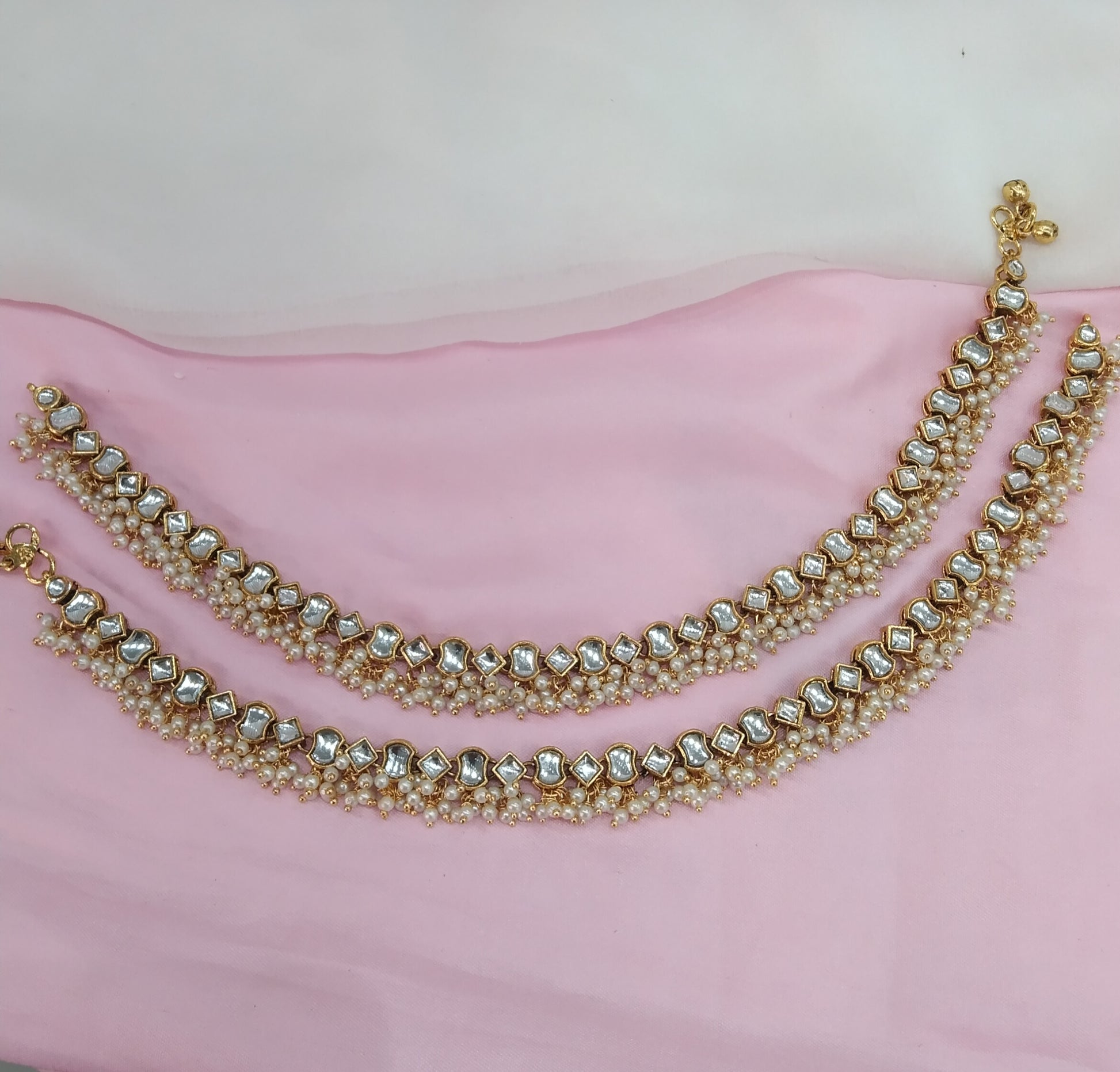 Gold White Kundan Anklets Jhanjar Payal Indian Jewellery opti Set