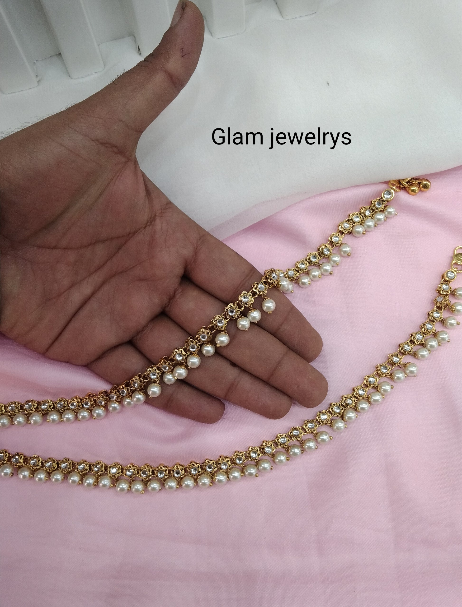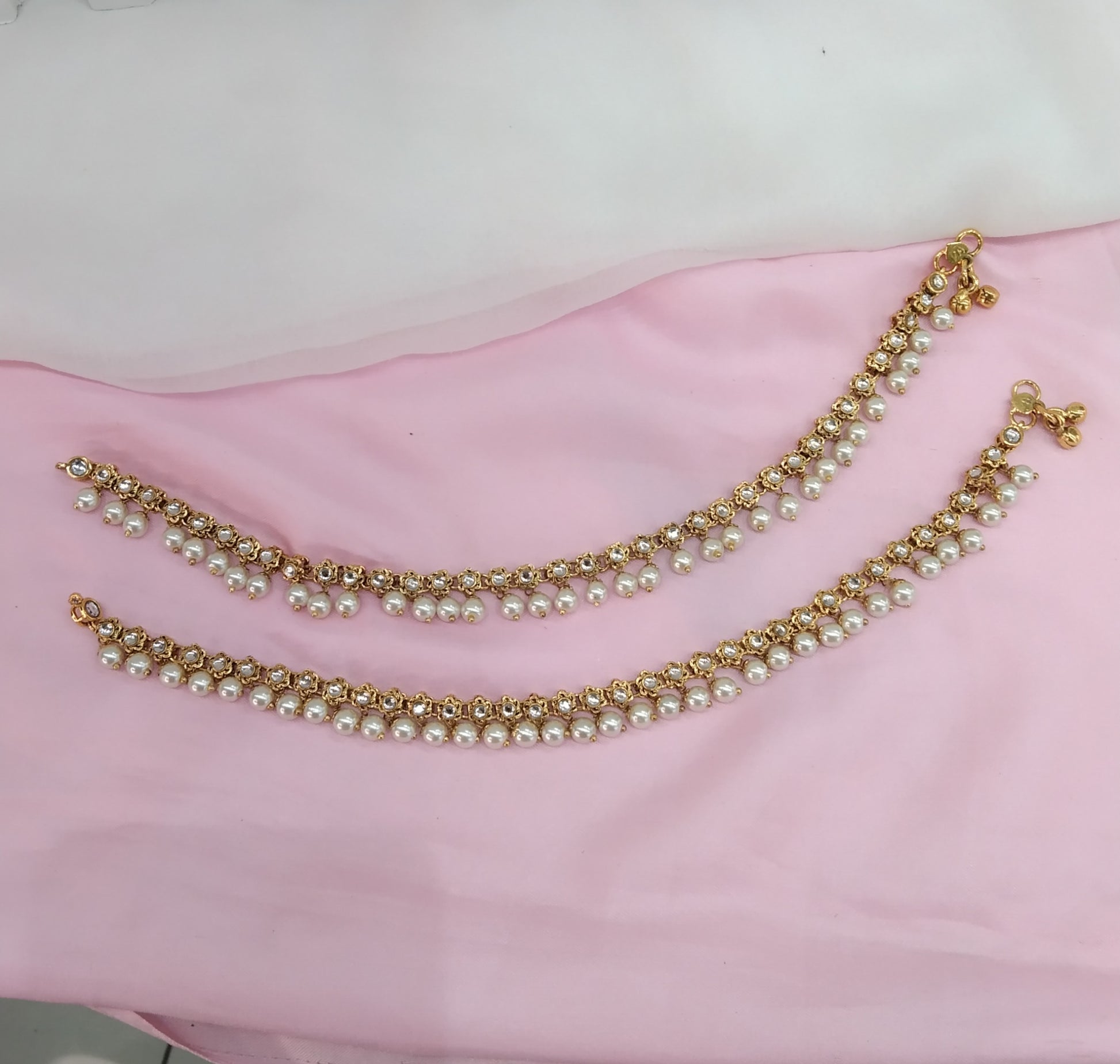 Gold White Kundan Anklets Jhanjar Payal Indian Jewellery opti Set