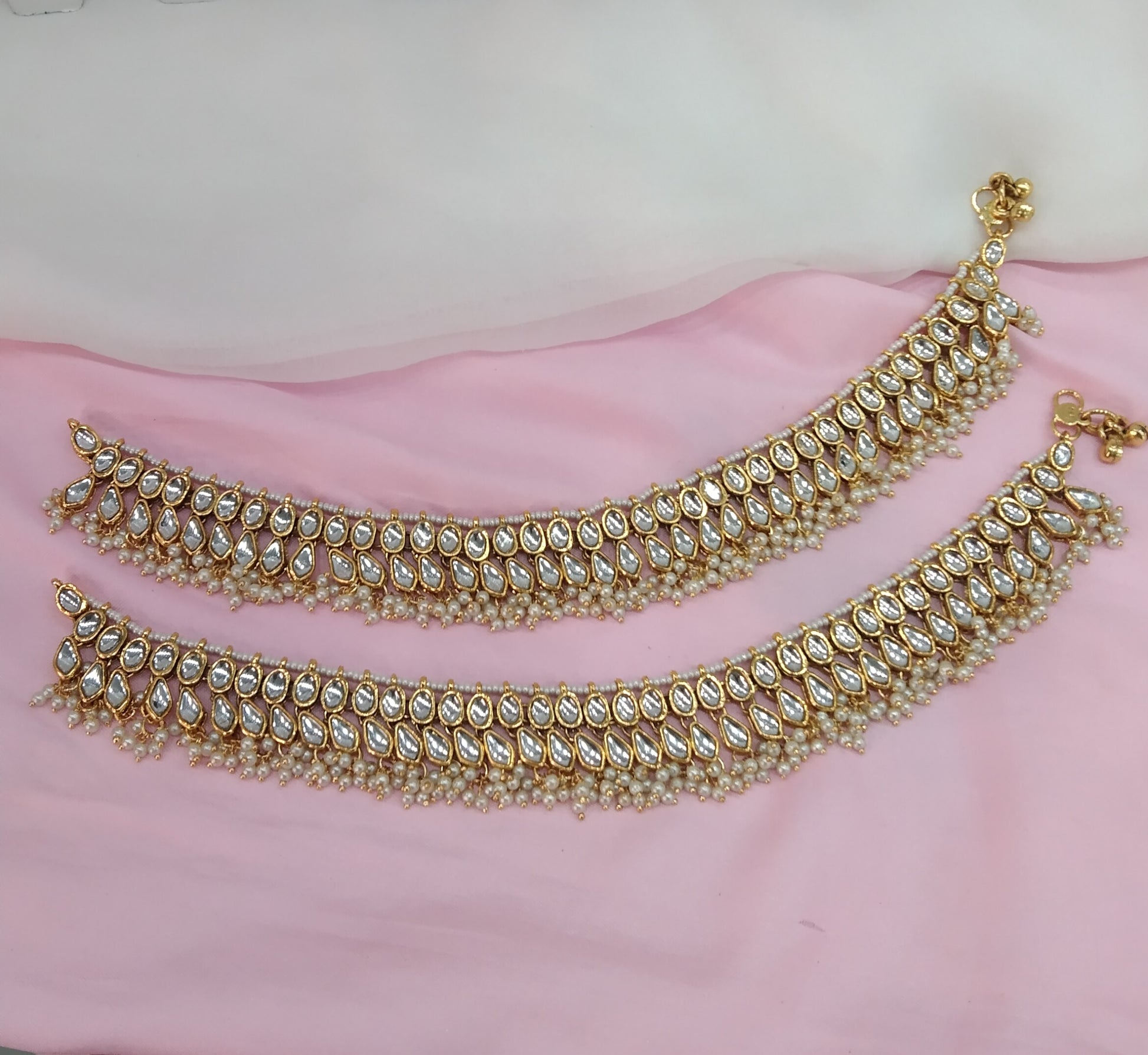 Gold White Kundan Anklets Jhanjar Payal Indian Jewellery opti Set