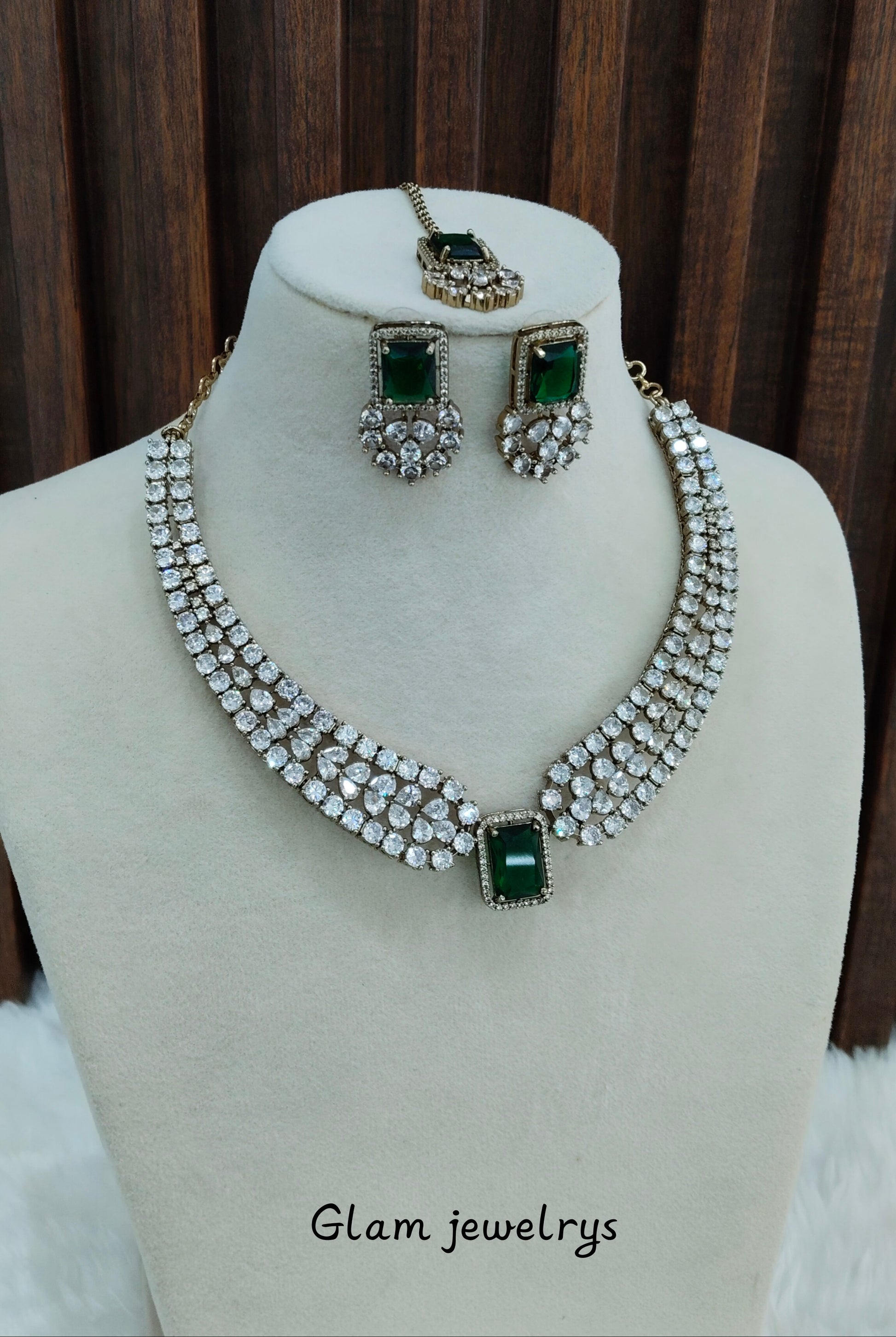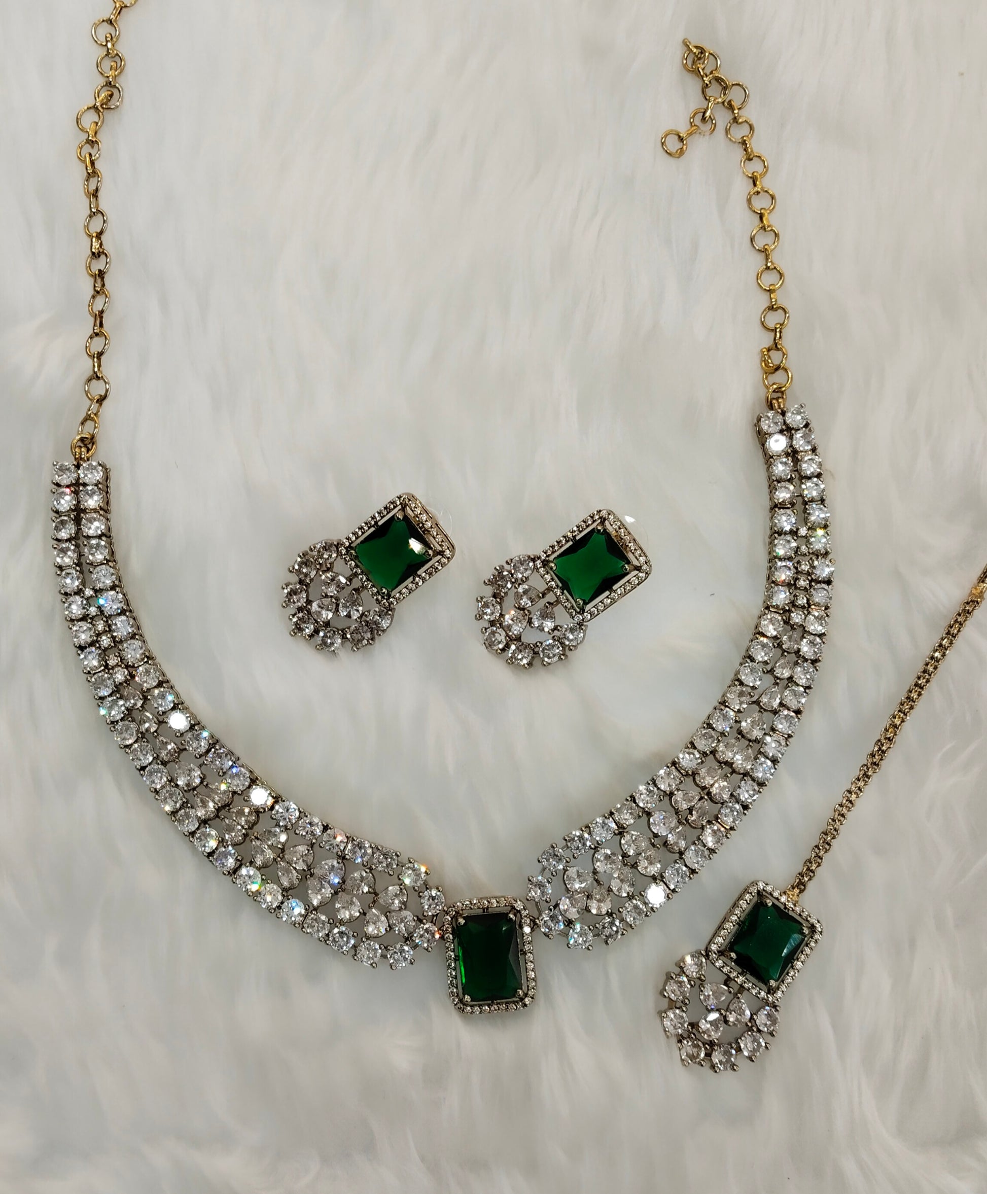 Green Antique Gold CZ Necklace Indian Jewellery Tvs Set