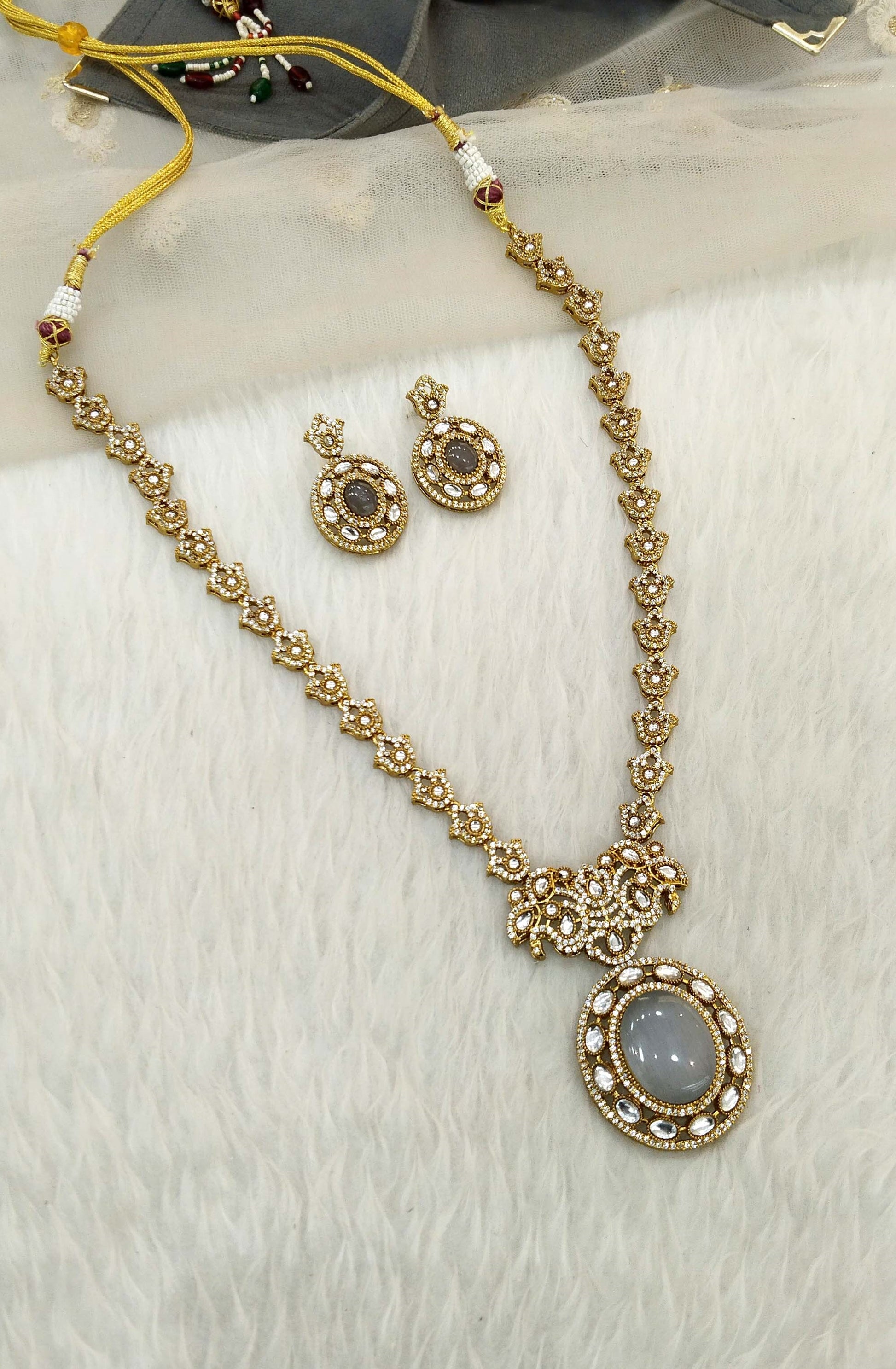*Moissanite kundan grey long necklace set.