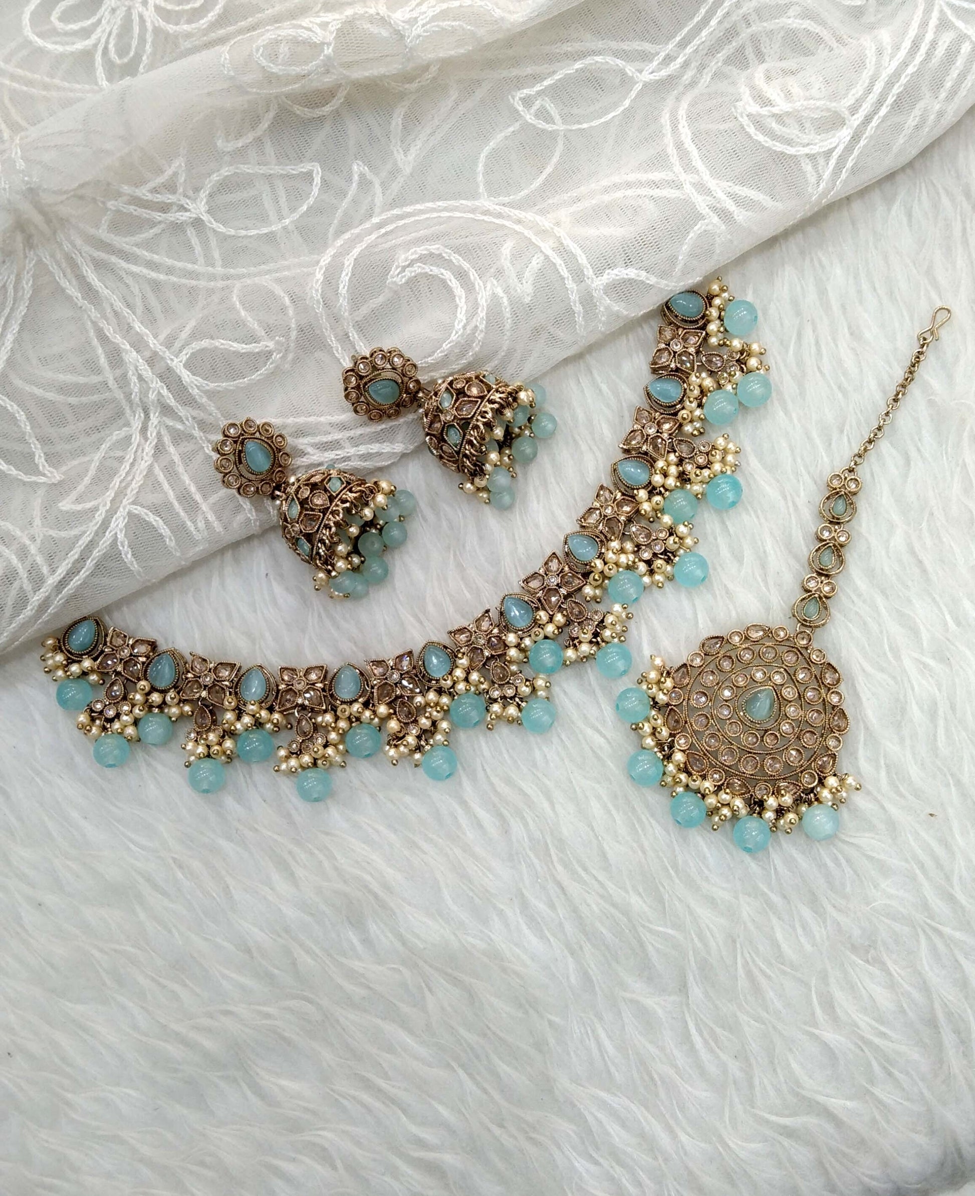 Indian Jewellery Antique Gold Sky Blue necklace Tikka Set/Gold Bollywood Disha Set