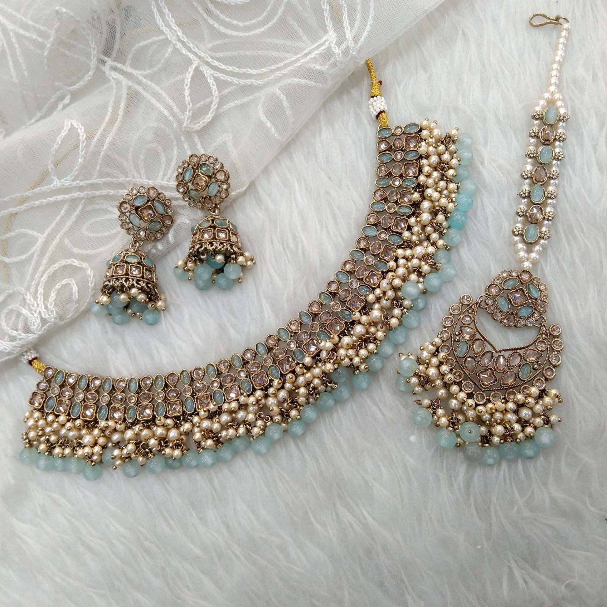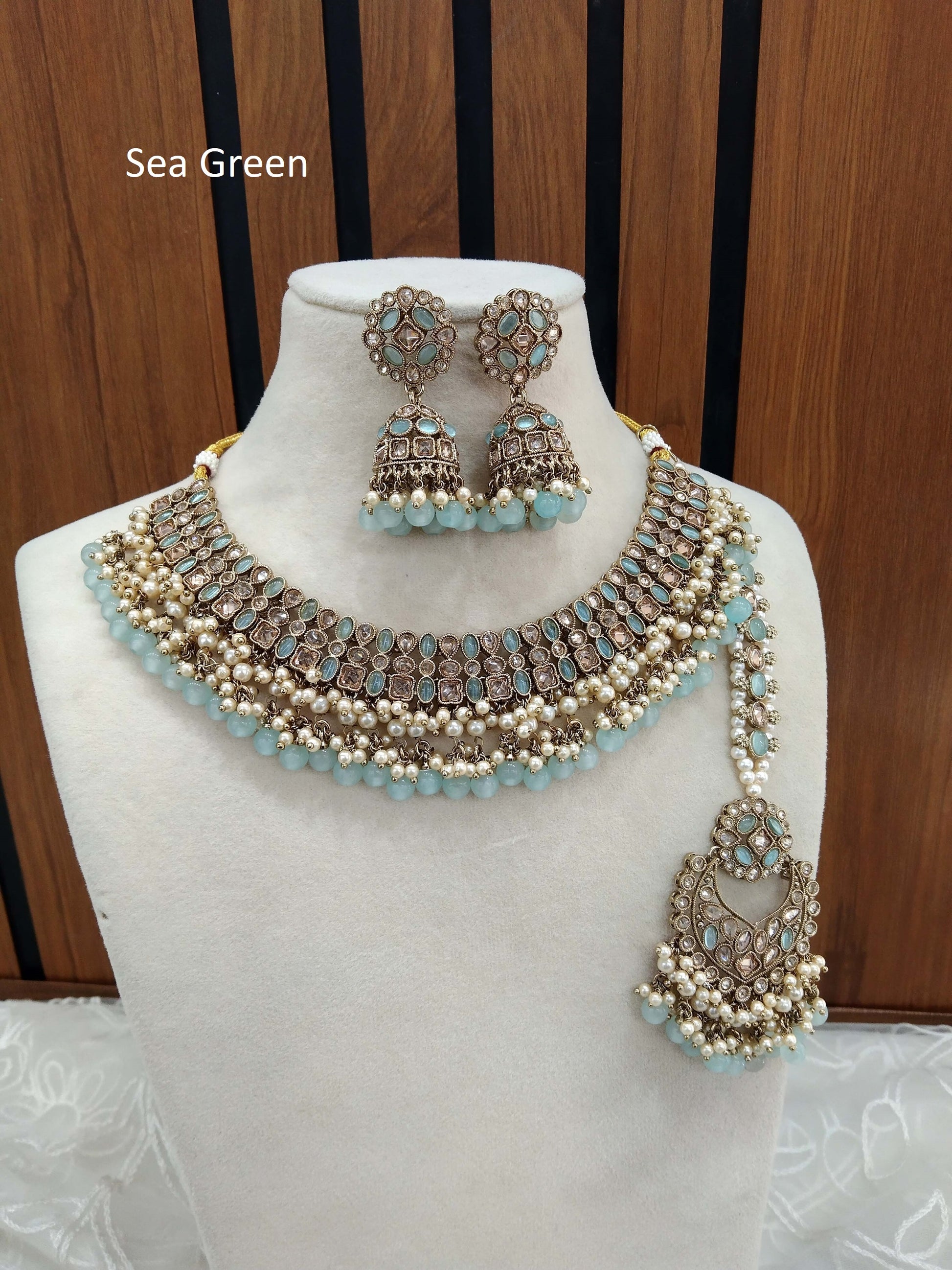 Indian Jewellery Antique Gold Sea Green necklace Tikka Set/Gold Bollywood Juhi Set