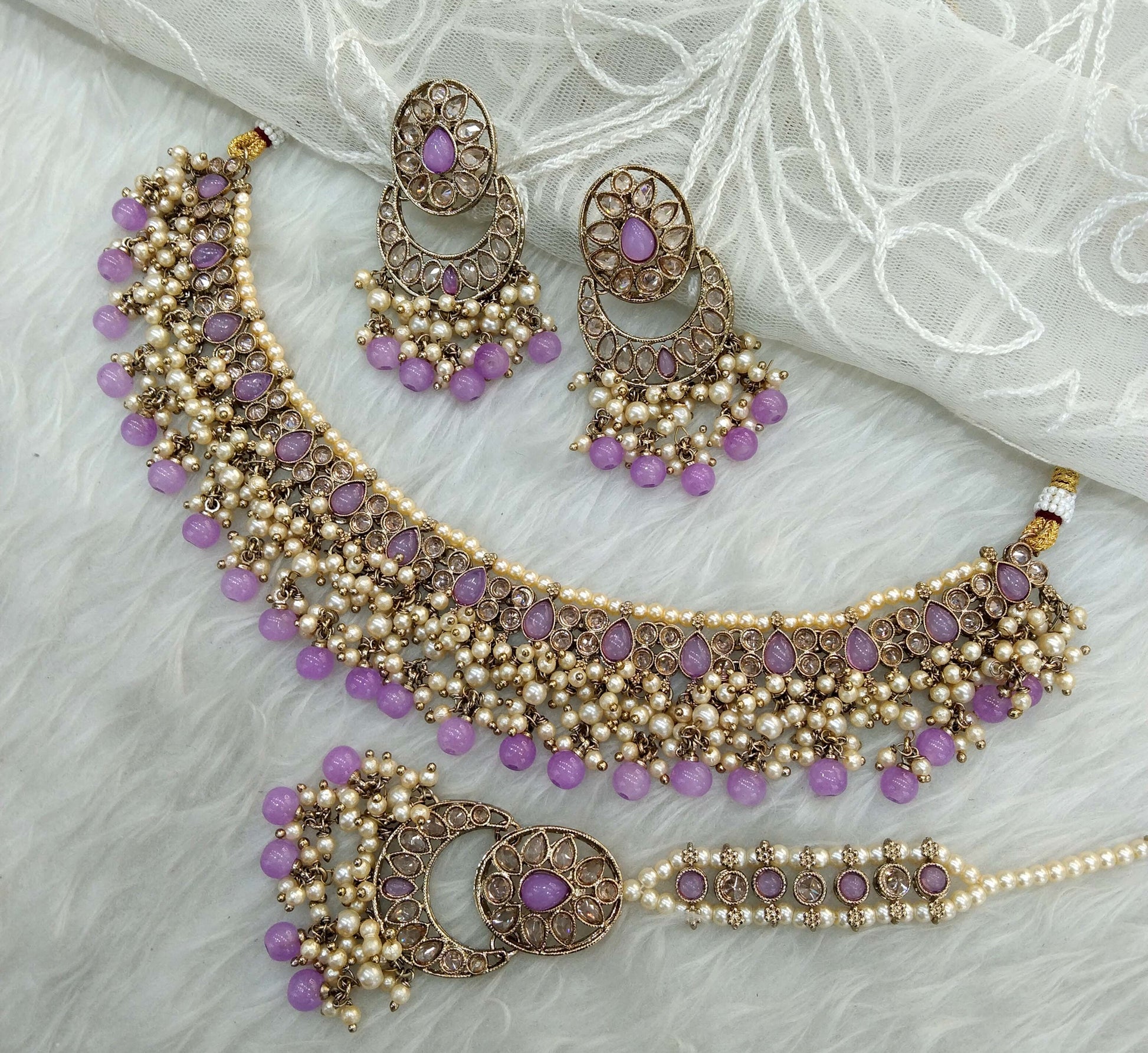 Indian Jewellery Antique Gold Lavender necklace Tikka Set/Gold Bollywood Jass Set