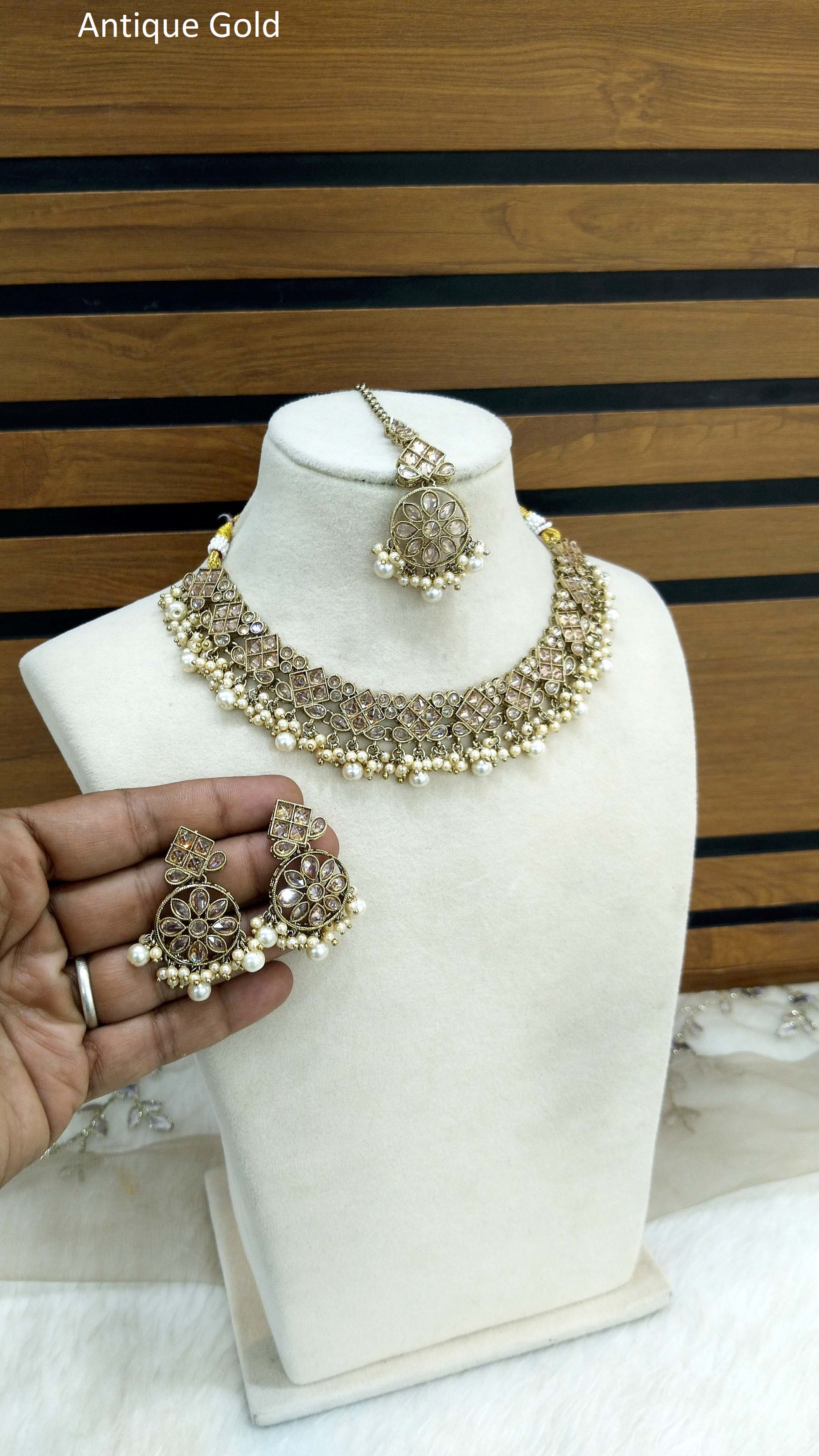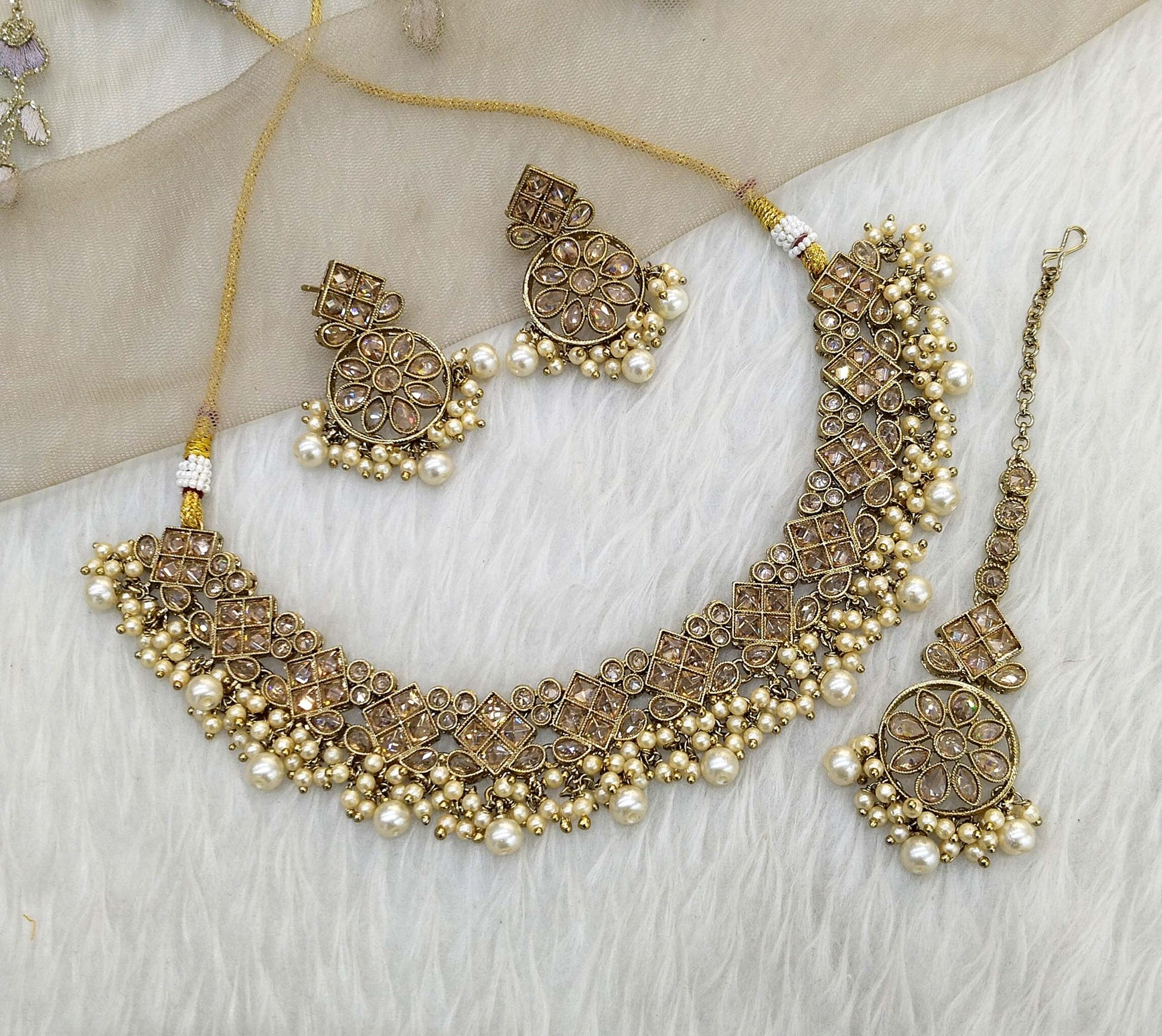 * Light weight antique gold necklace set studded with crystals.