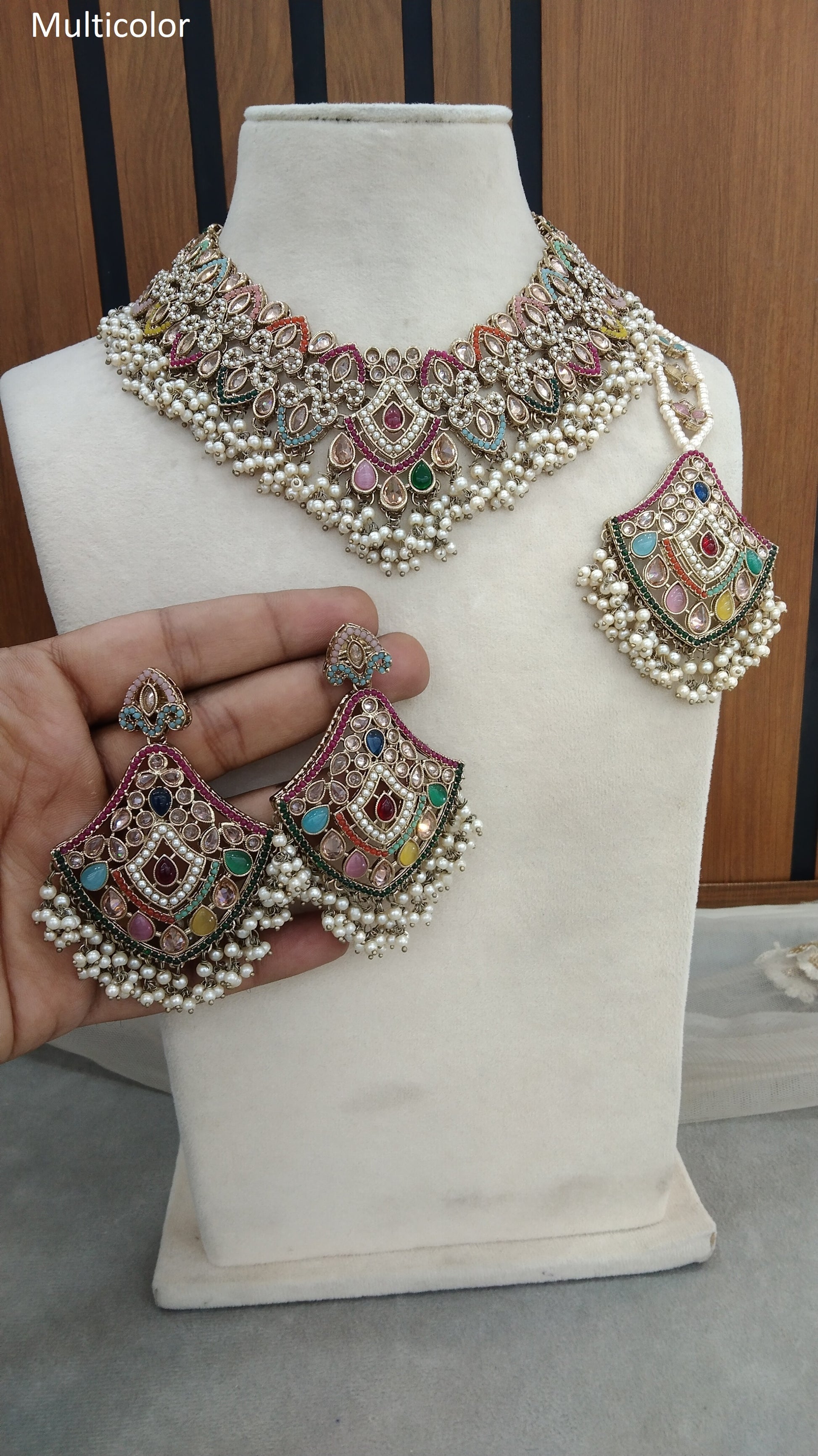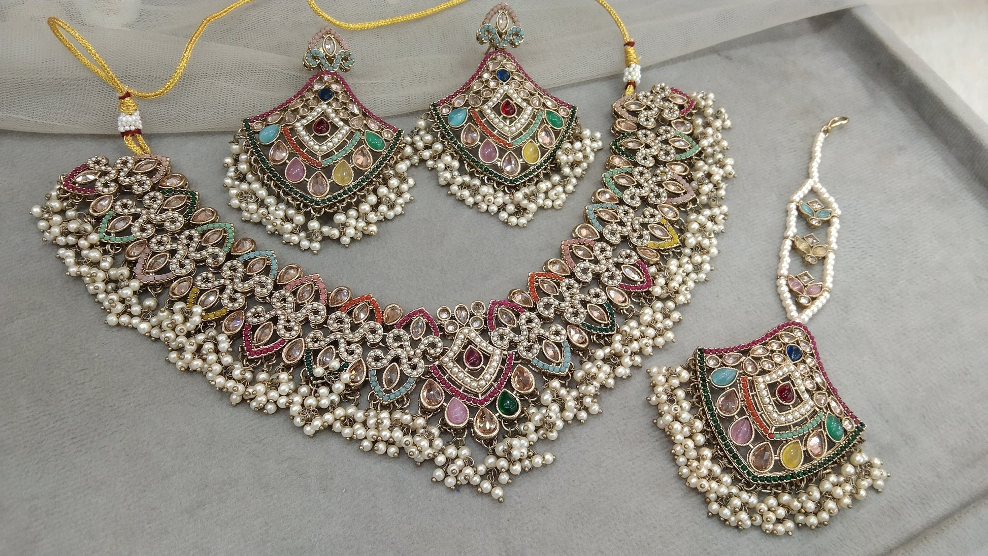 Indian Jewellery Antique Gold Multicolor necklace Tikka Sital Set