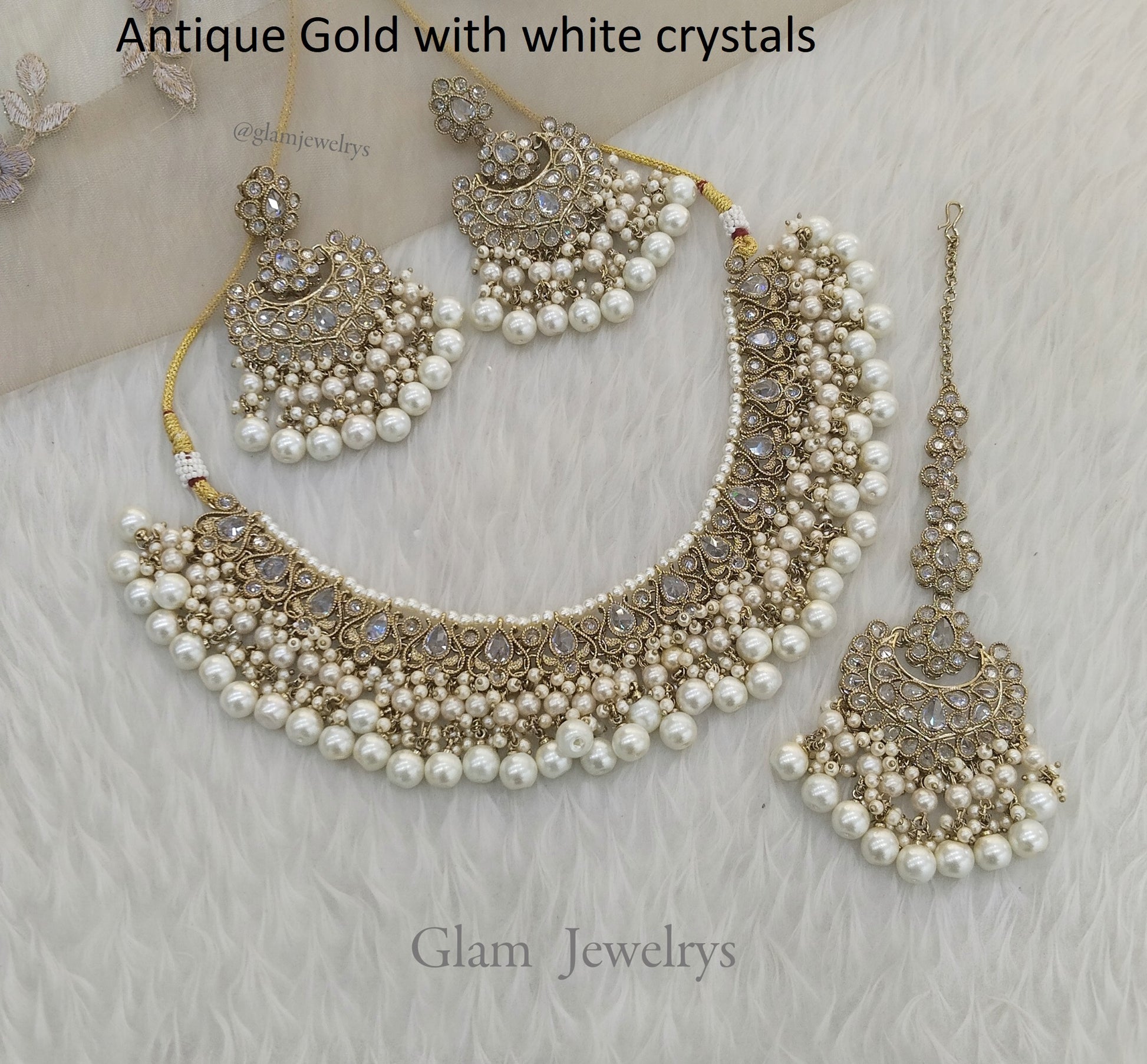 Indian Jewellery Antique Gold with white crystals necklace Tikka Set/ Parisha