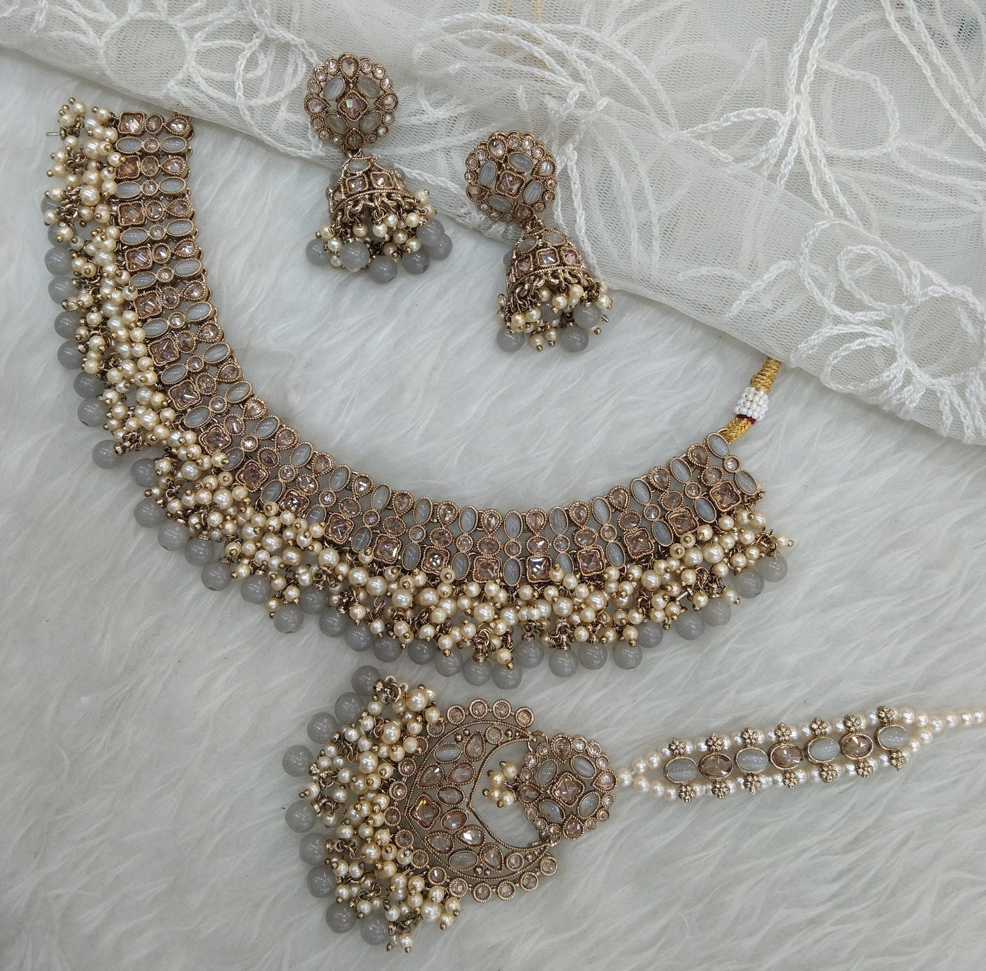 Indian Jewellery Antique Gold Grey necklace Tikka Set/juhi