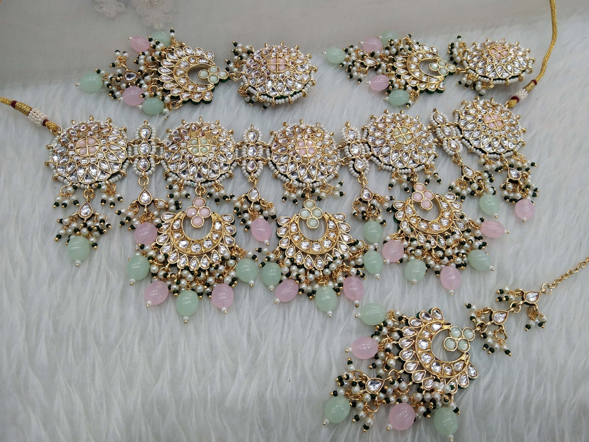 Gold mint pink Kundan necklace Set/ Gold kundan Indian jewellery kundan runes sets