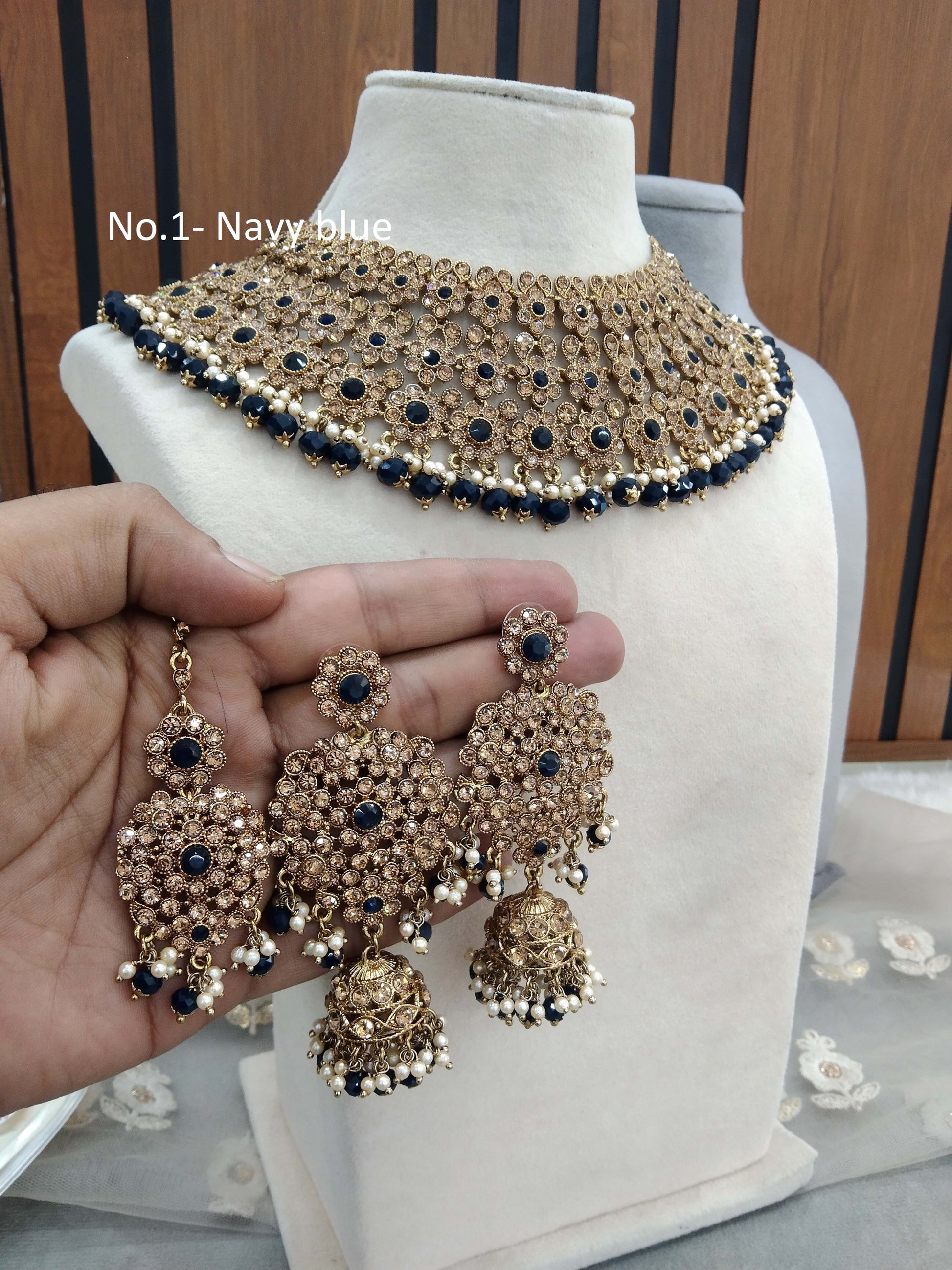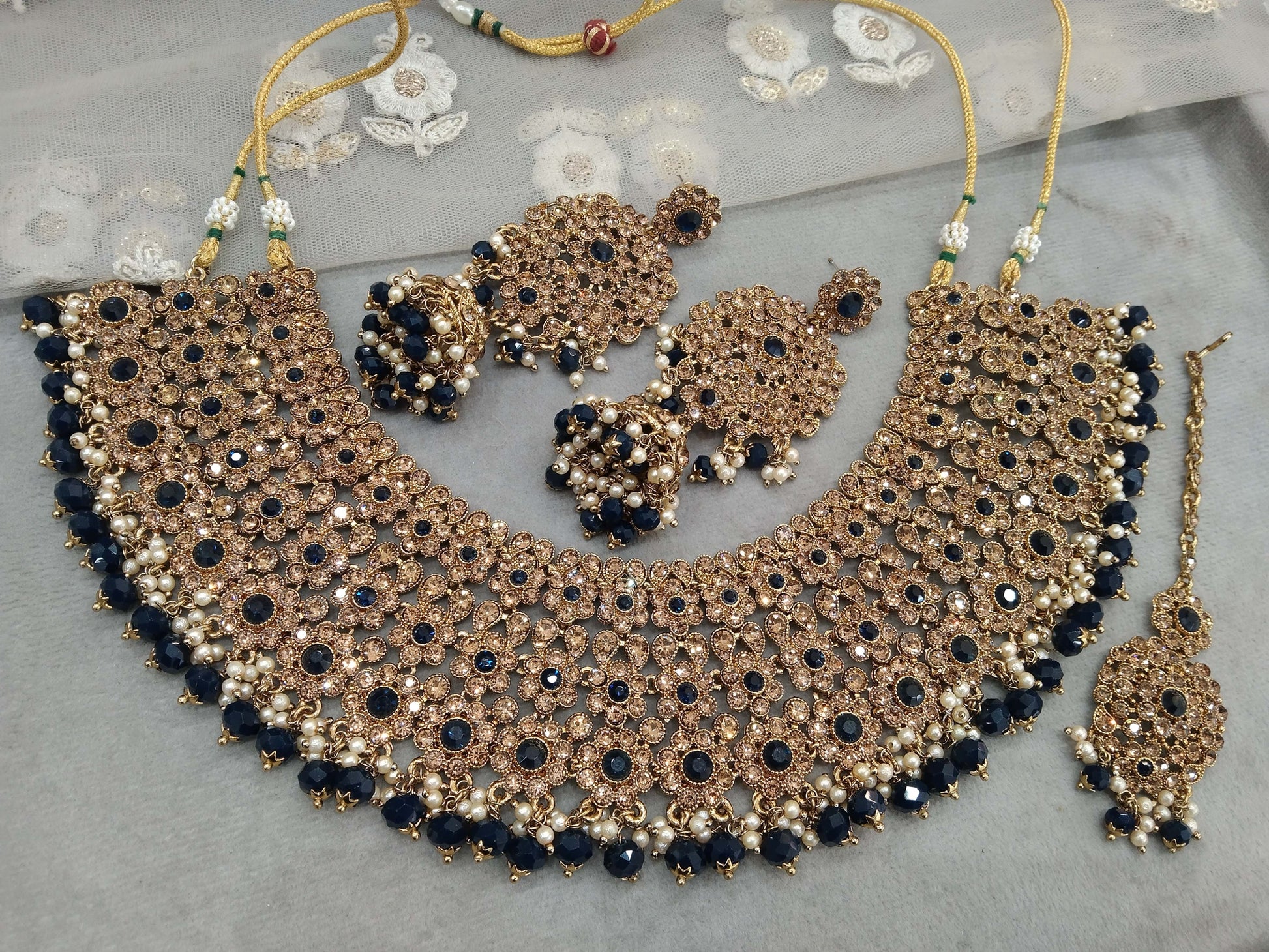 Indian Jewellery/Semi Bridal Gold Navy Blue jewellery Necklace Aditi set