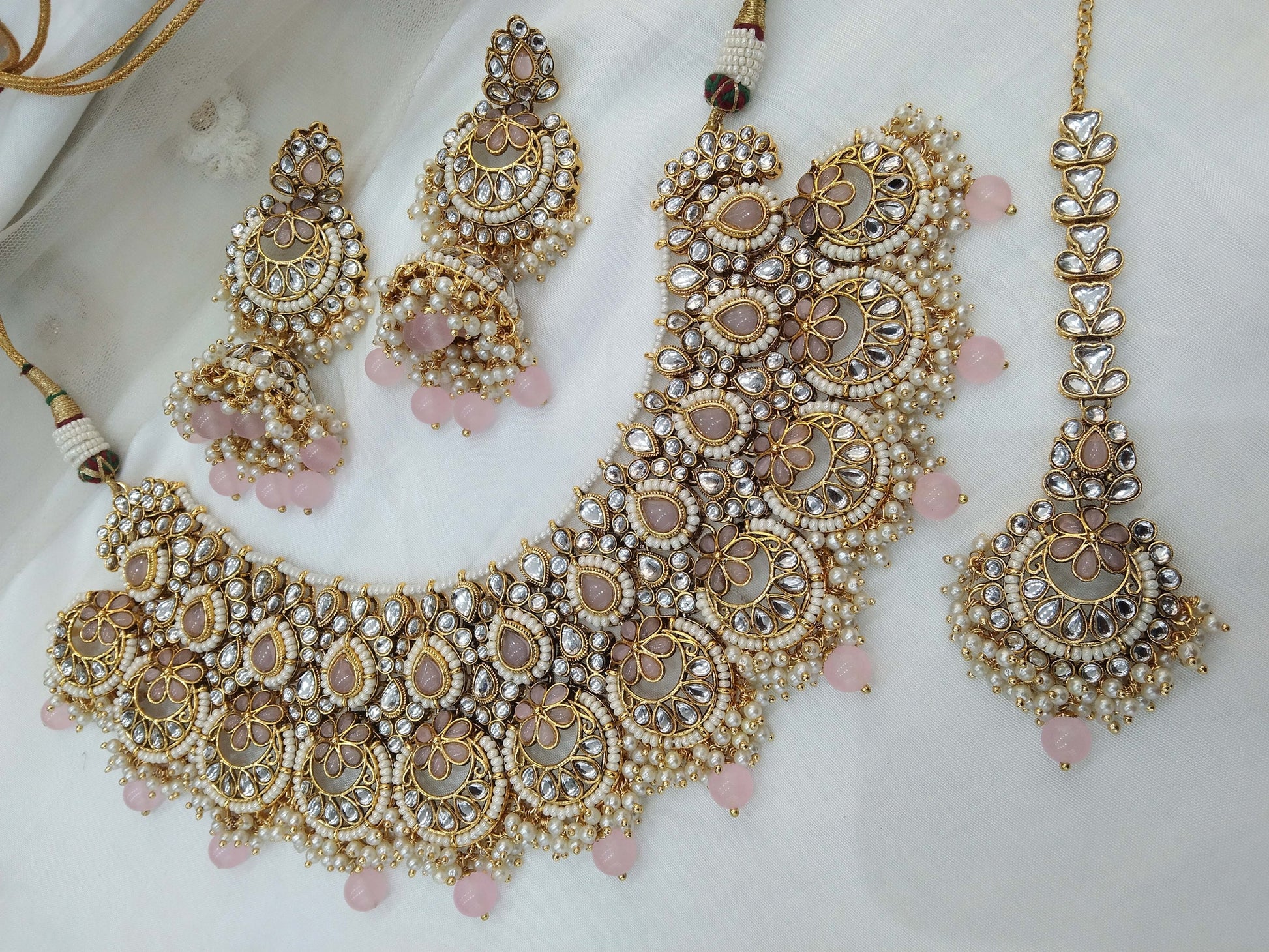 Indian Jewelry/ Gold Baby pink Kundan necklace Set Indian gold Harris Necklace