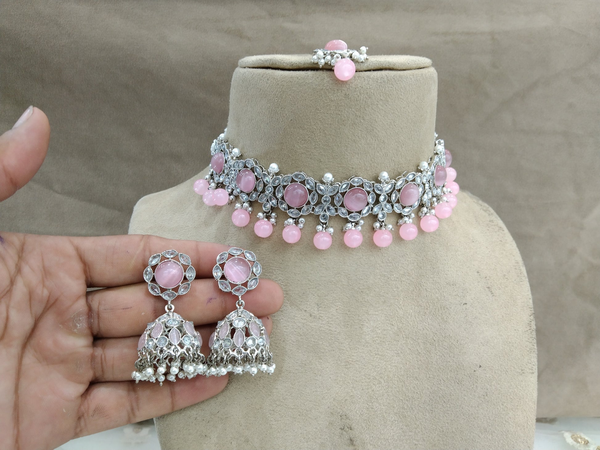 Indian jewellery choker set/Rhodium finish silver pink choker set bridal bendigo jewellery