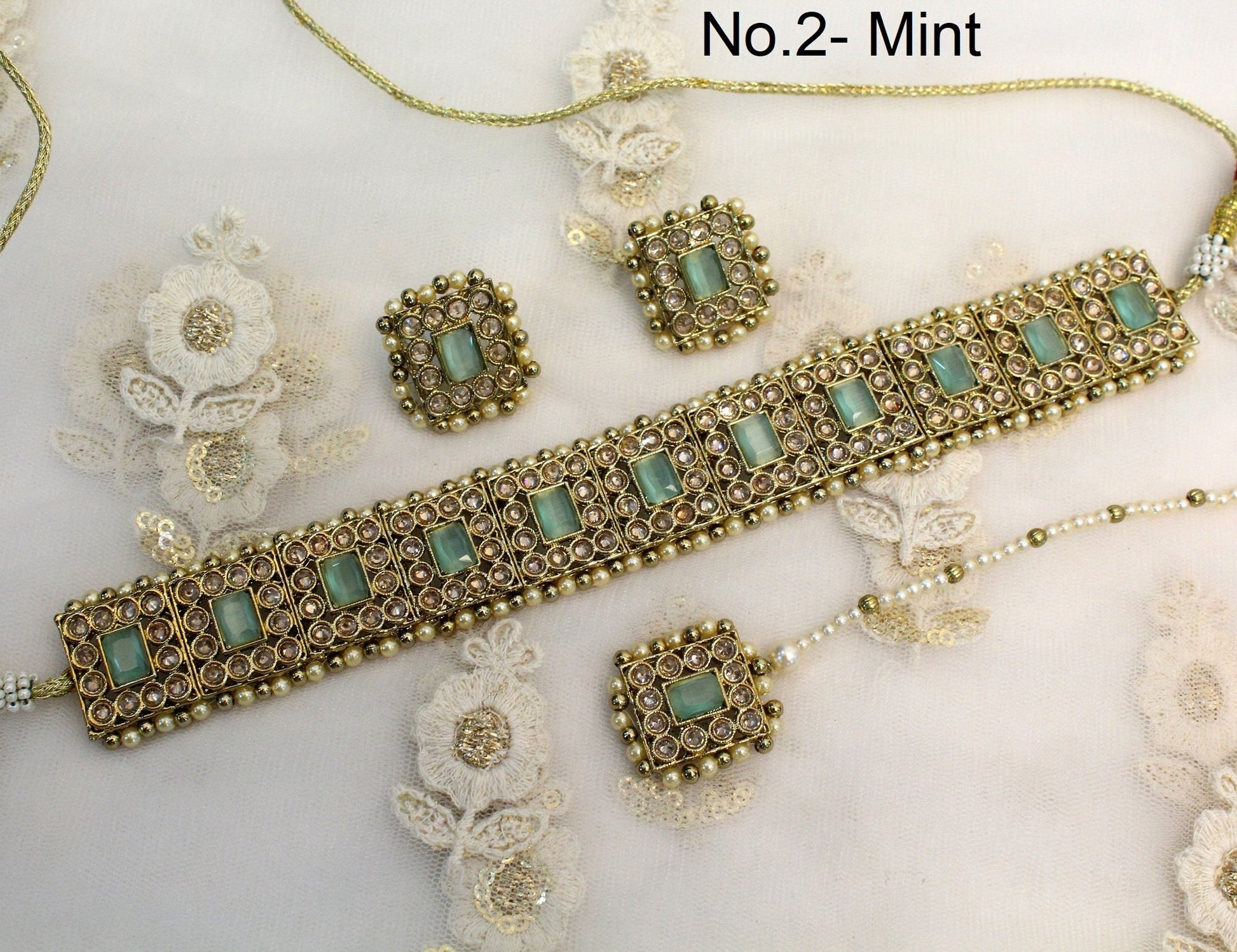 Indian Jewellery choker Set/Gold ,mint, pink, multicolor Bollywood choker Set/Indian choker Mehndi Polish necklace