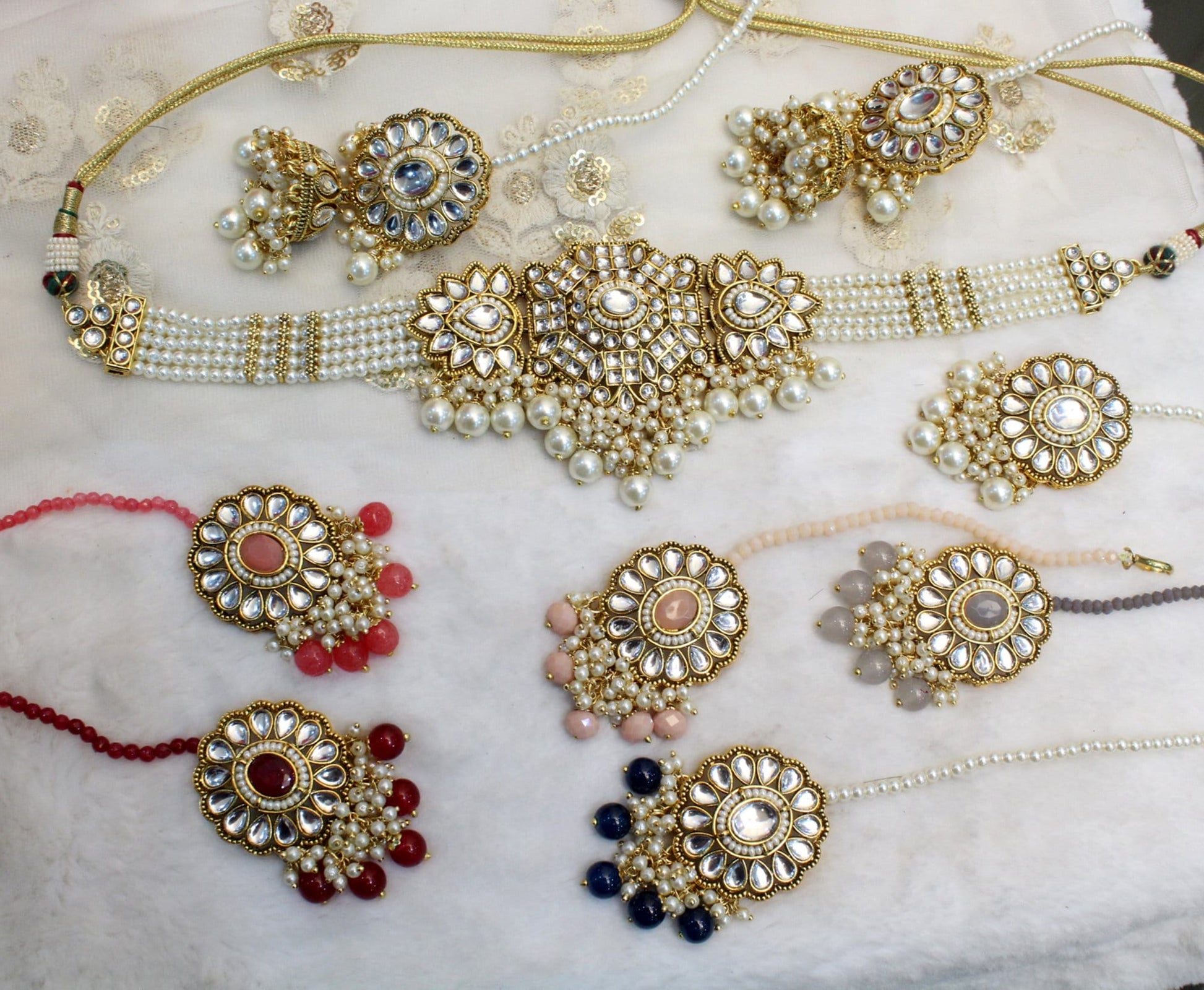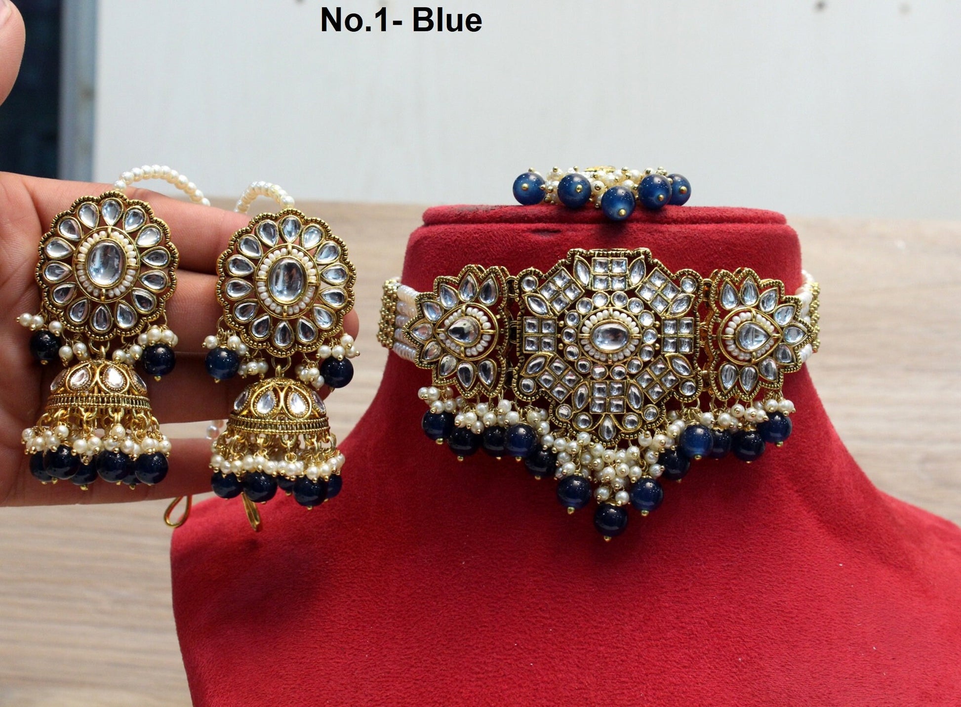 kundan Choker Set Necklace Earrings Set/Grey, blue, ruby choker set Indian Jewellery Necklace Set/Indian Choker Set