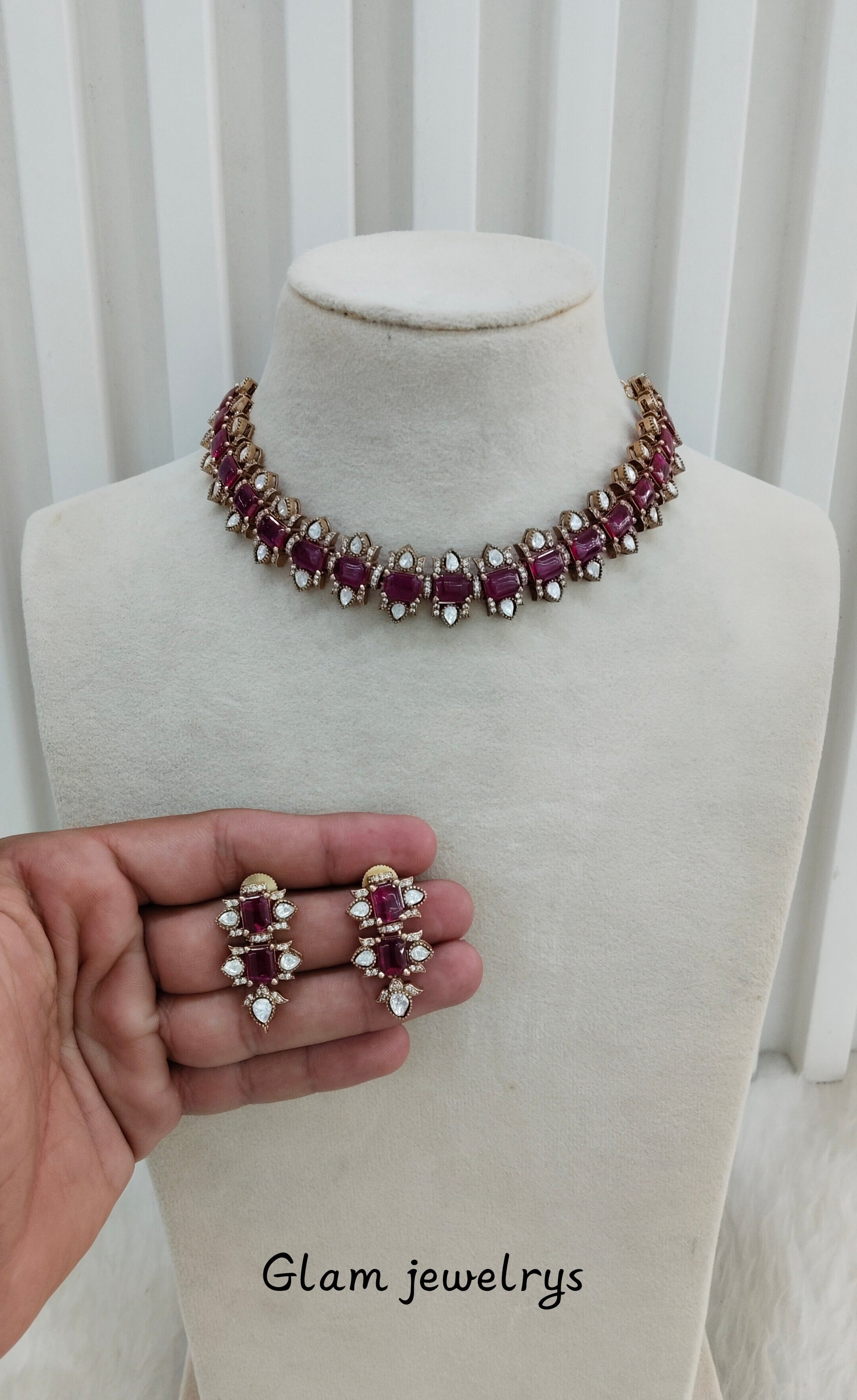 Majenta Gold Moissanite Kundan Necklace Indian Jewellery Indofarm Set
