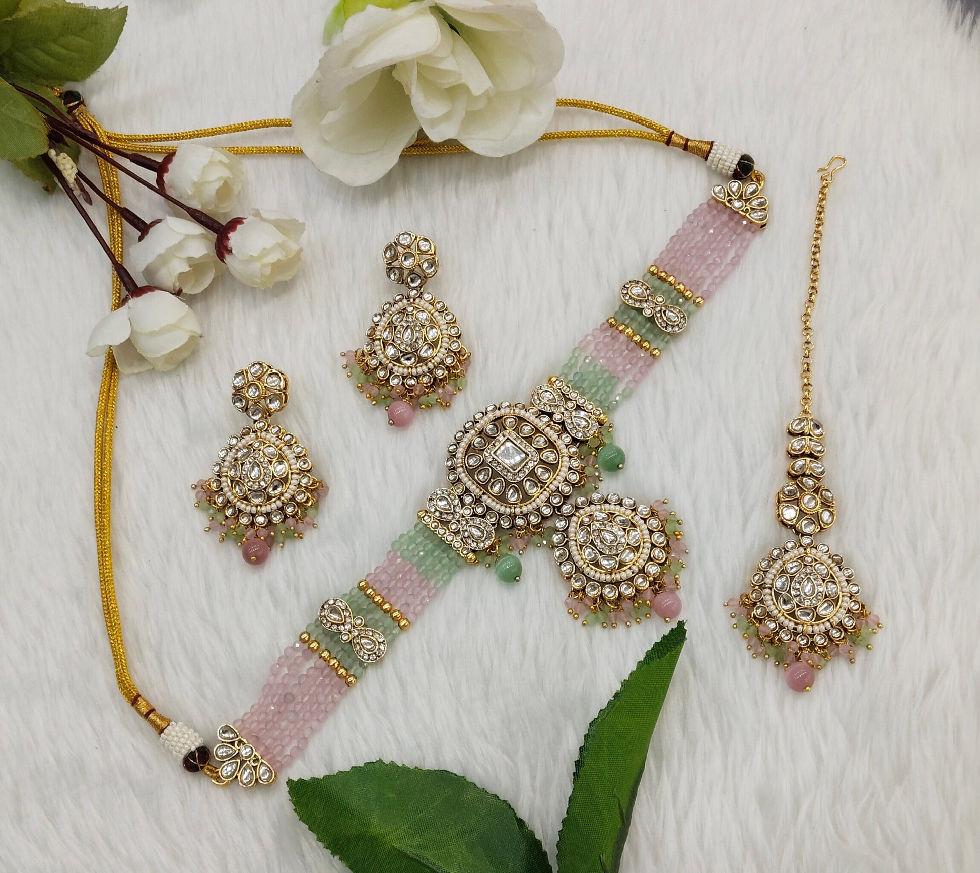 Indian Jewellery Pink Kundan Choker Set/ kundan choker hello Set