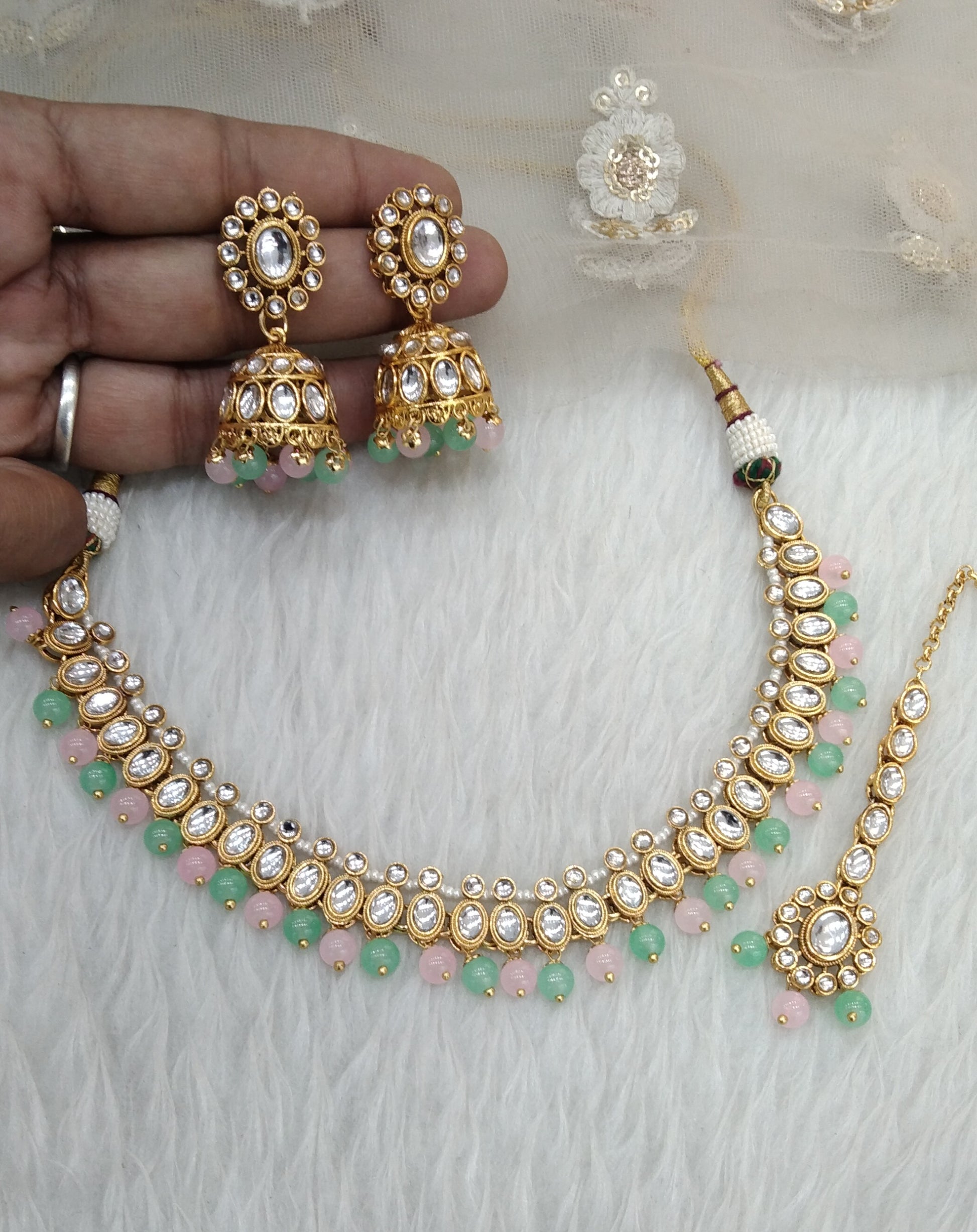 Mint Pink Indian Jewellery kundan Necklace Lisa set