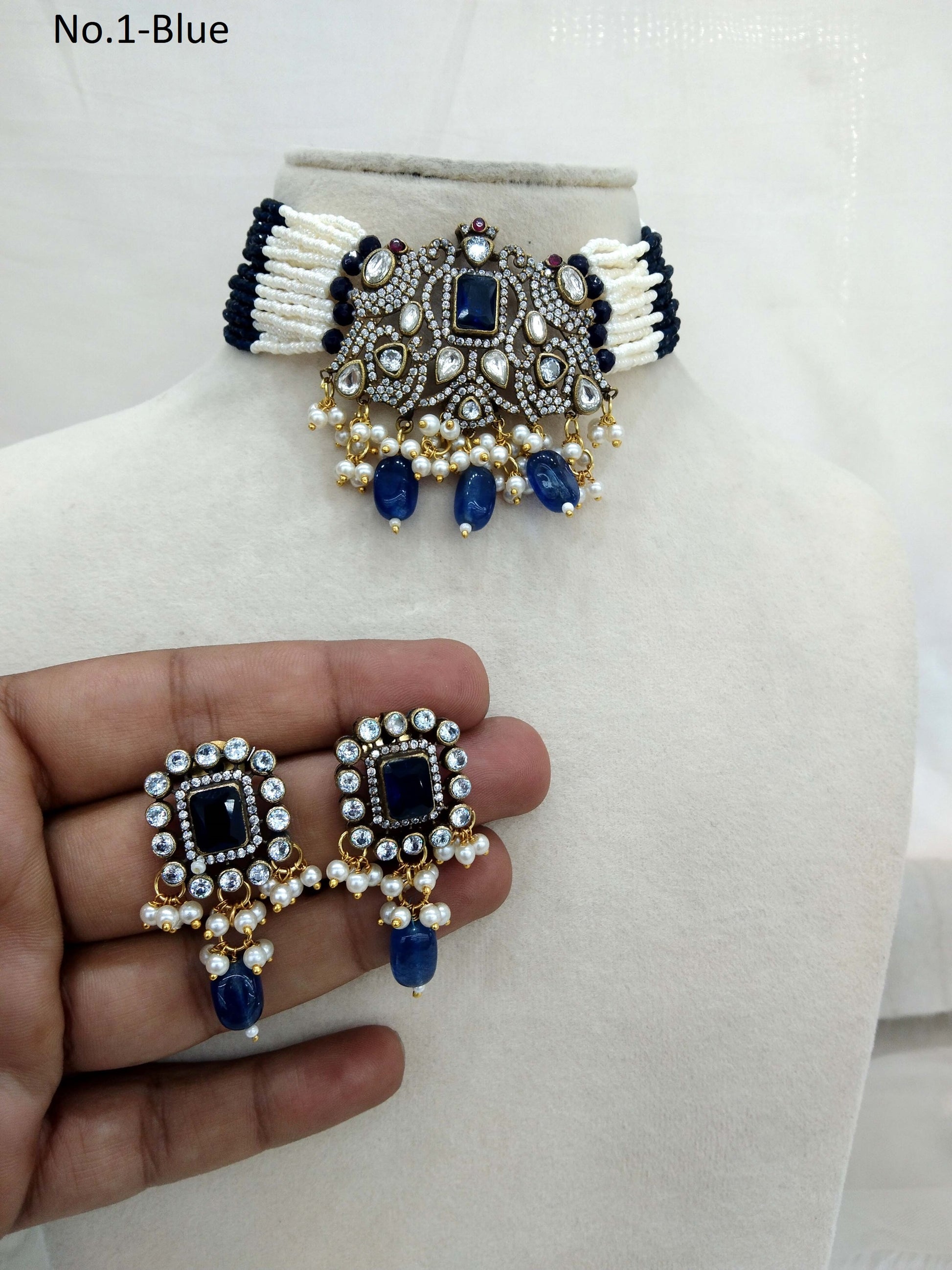 Moissanite kundan Gold Blue choker Indian Jewellery jassi Wedding Set