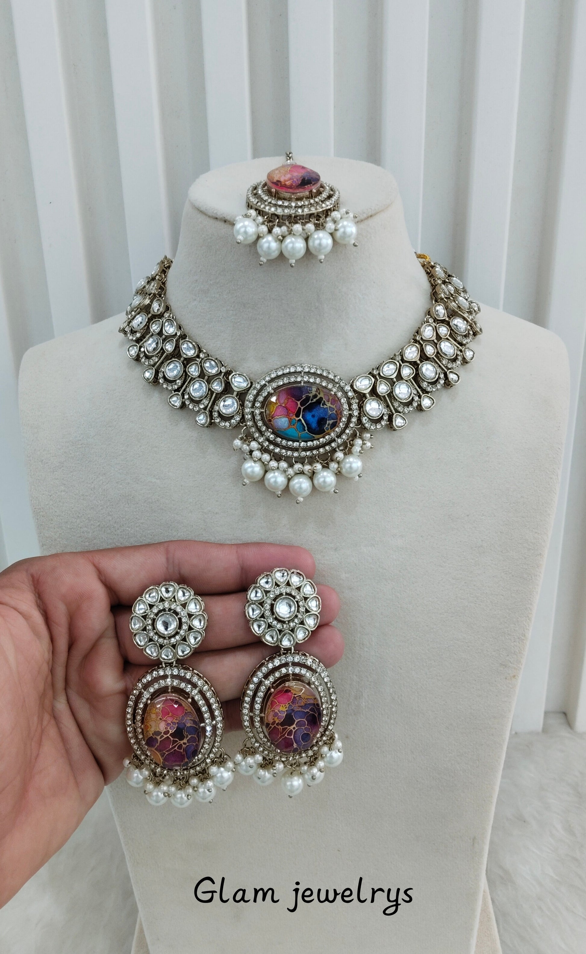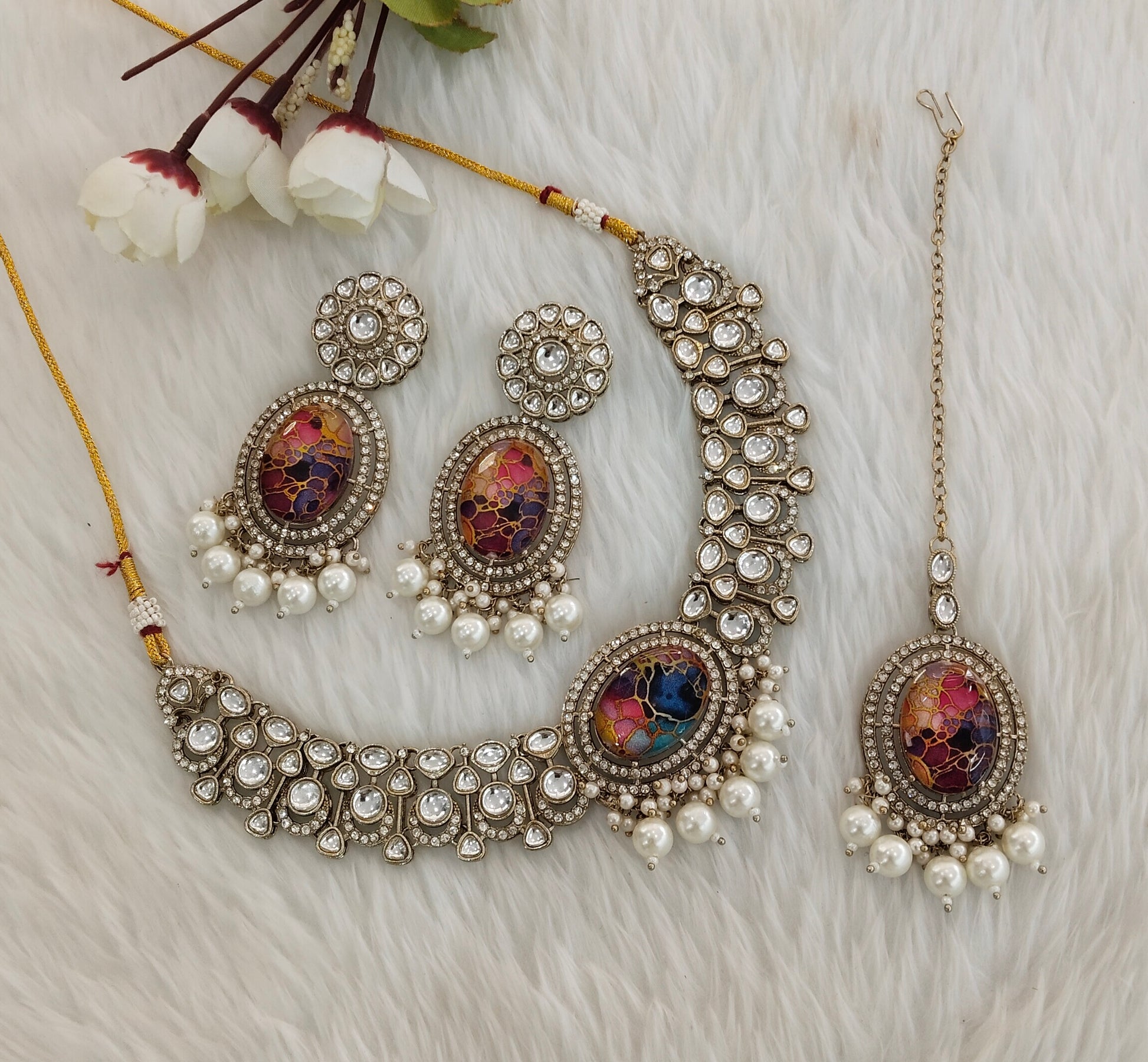 Multi Color Antique Gold Kundan Necklace Indian Jewellery Wanted Set