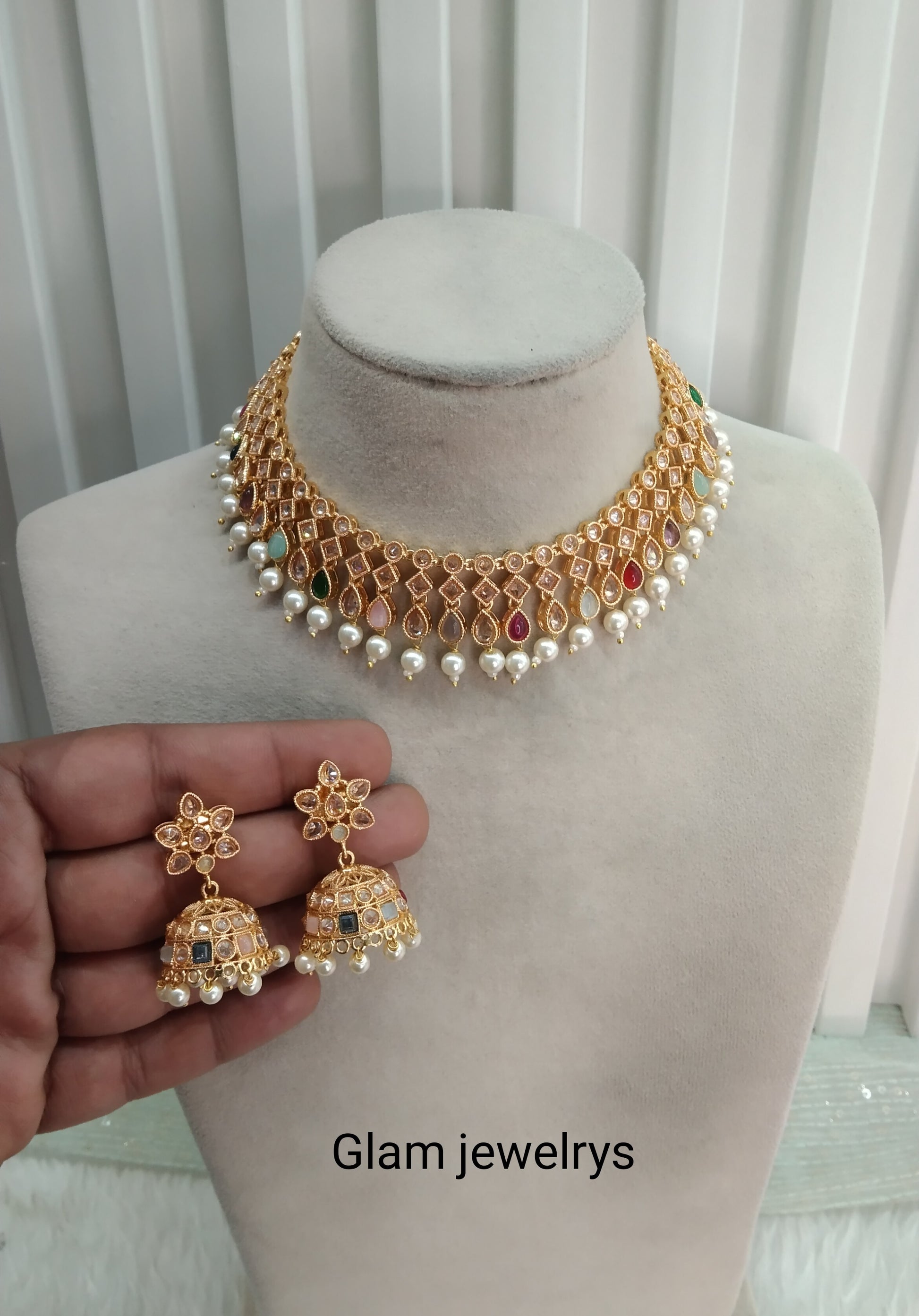 Multi Color Gold Polki Necklace Indian Jewellery Hanita Set