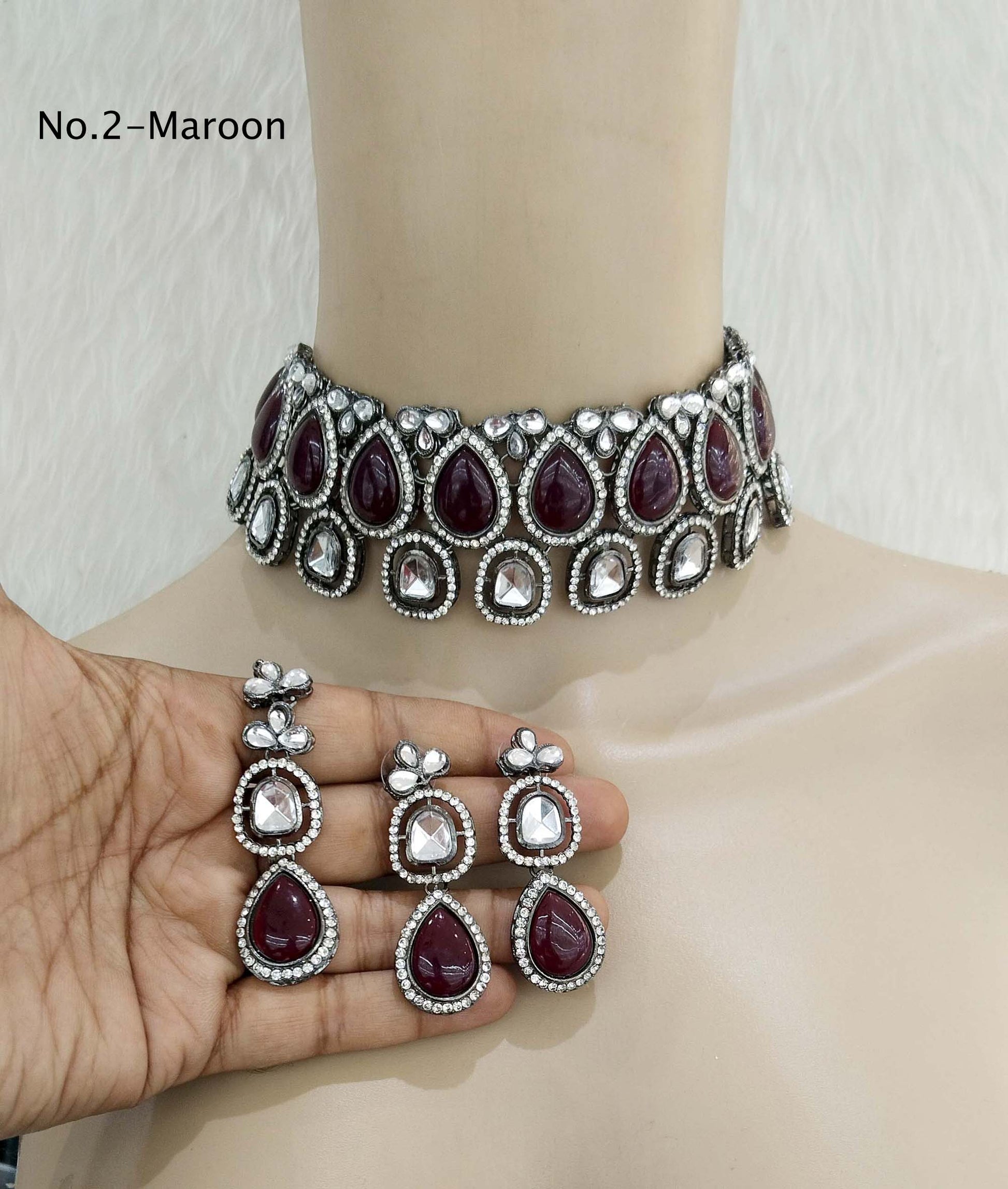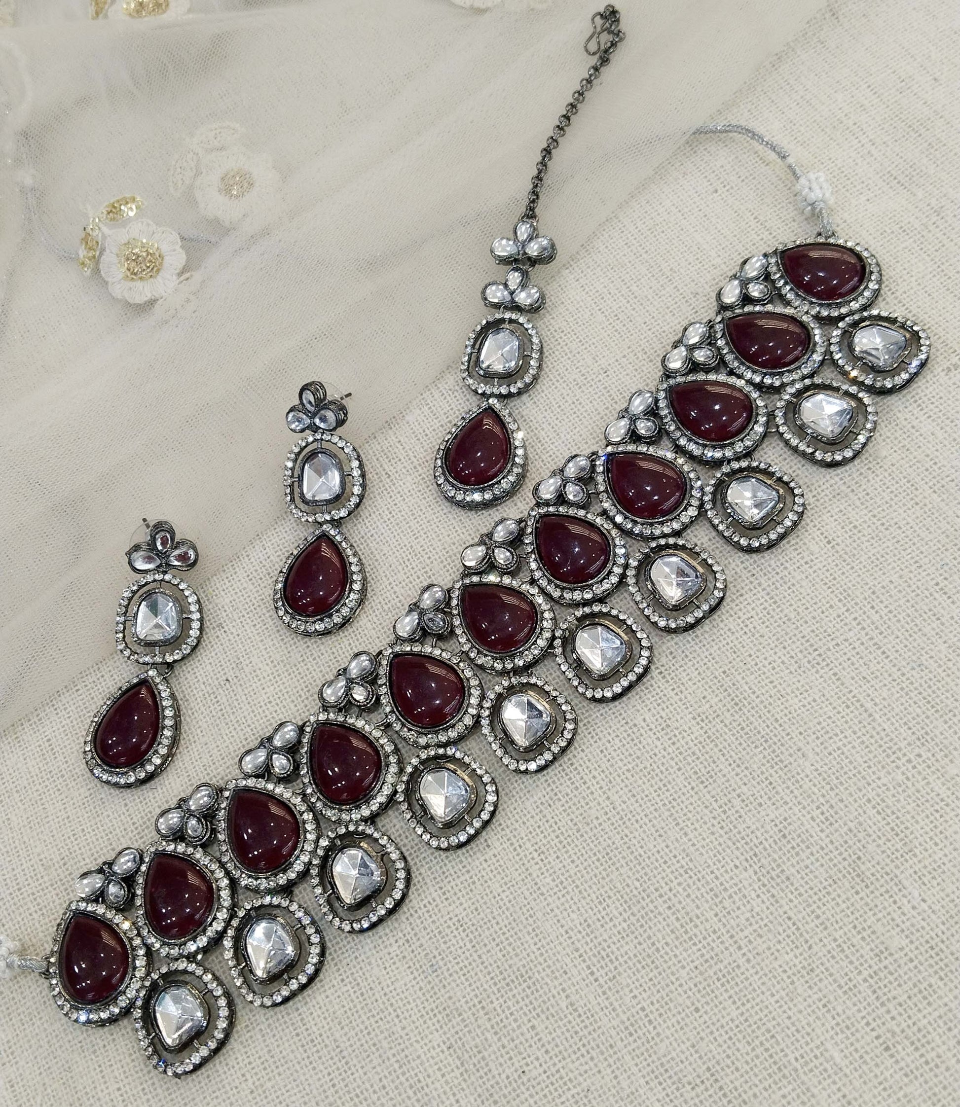 Oxidized silver kundan choker Set/ antique silver maroon tribal Indian bridal shelf Jewellery