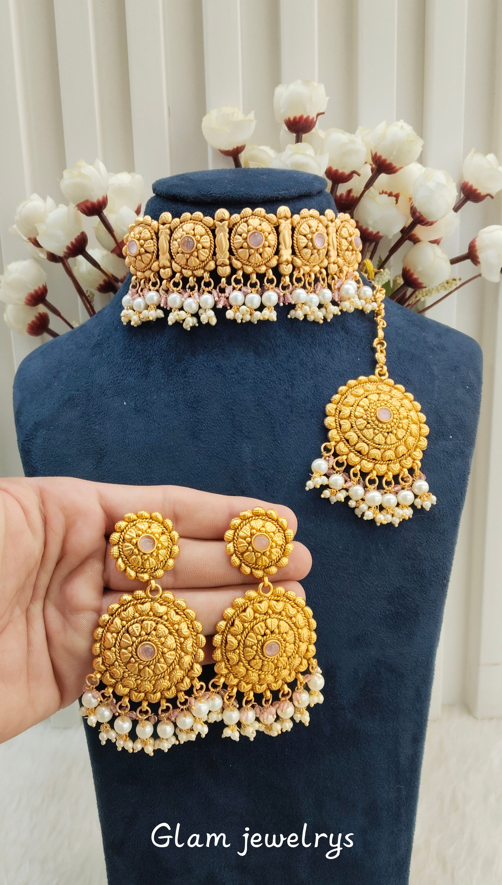 Pink Gold Polki Punjabi choker Indian Jeewellery Birpal set