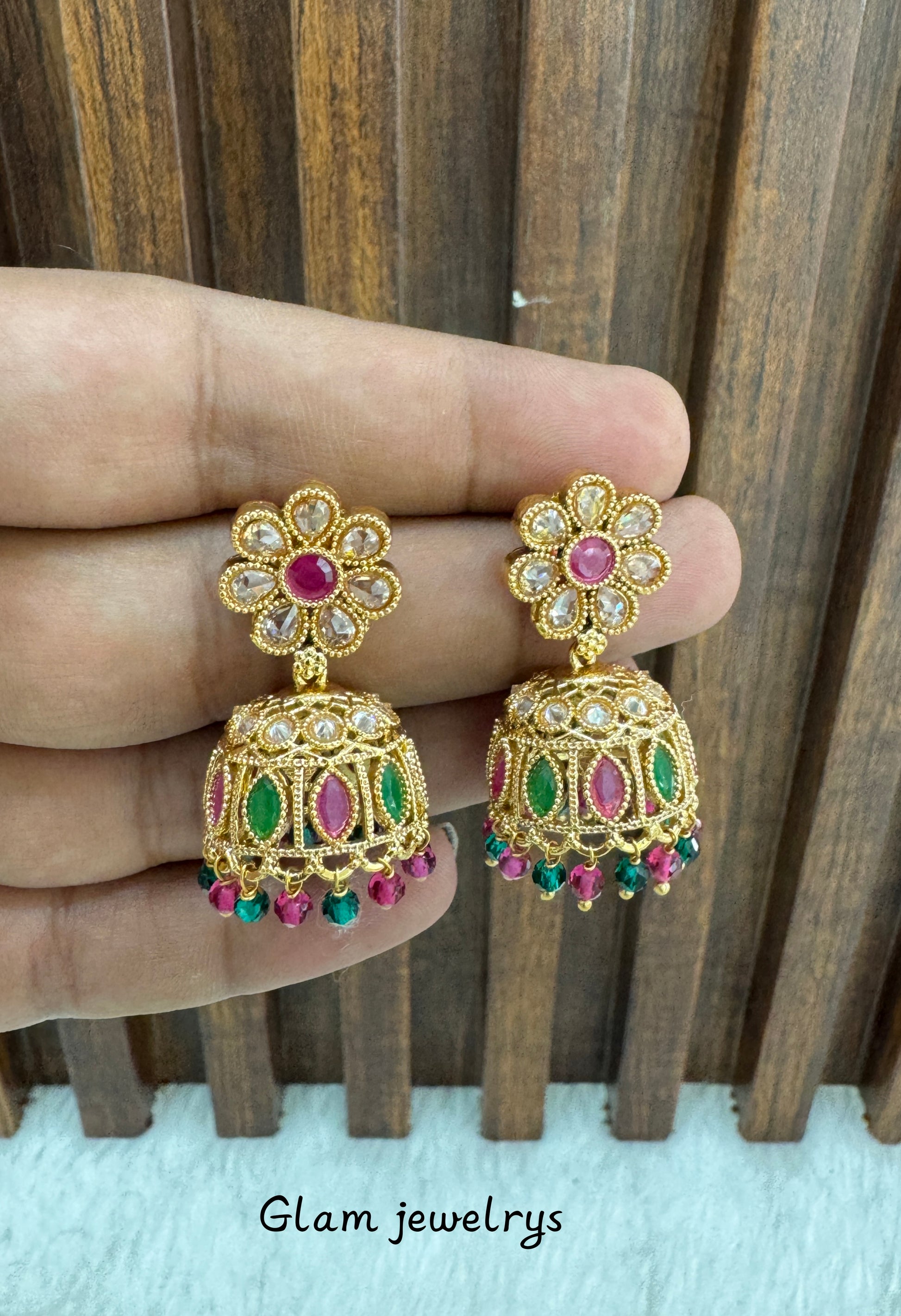 Ruby Green Gold Polki Jhumki Indian Bollywood Dhutta Earrings