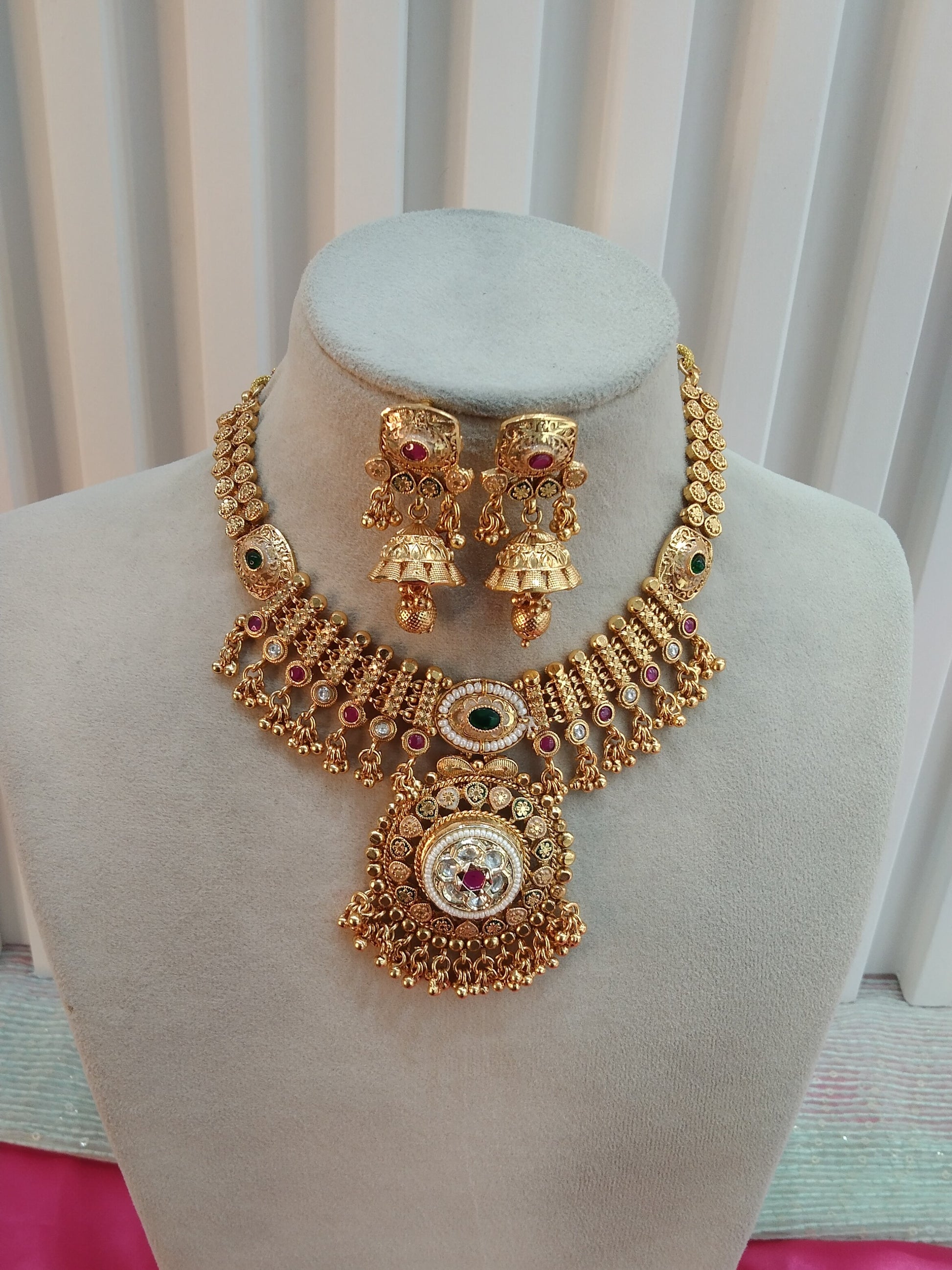 Ruby Green Gold Polki Jhumki Necklace Indian Jewellery Delta Set