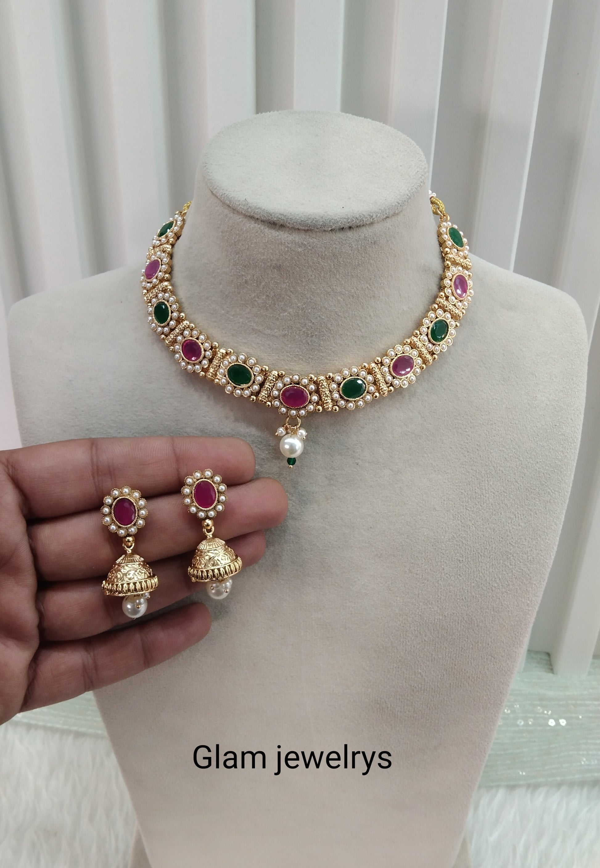 Indian Jewellery Pink Kundan Choker Set/ kundan choker hello Set