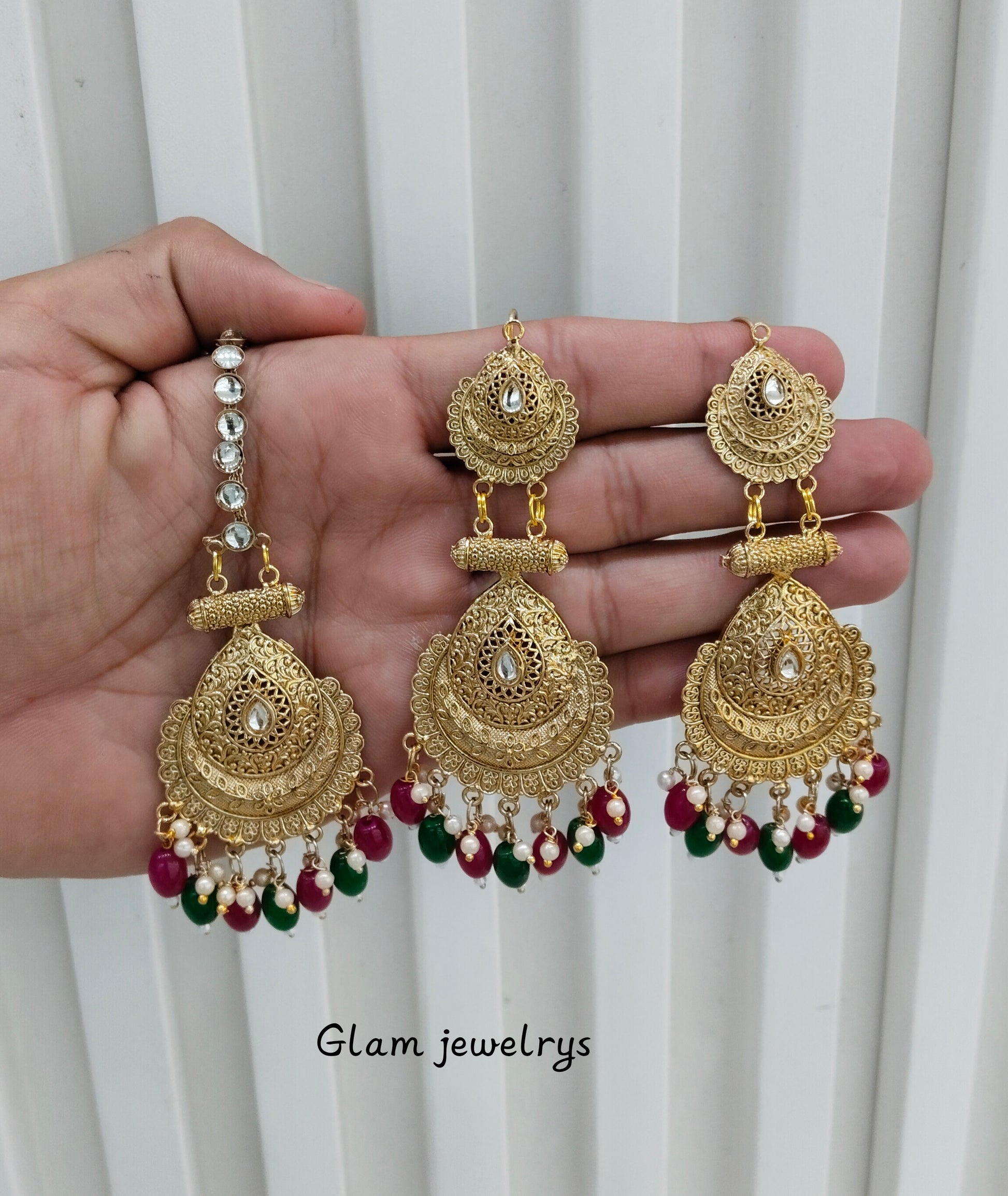 Ruby Green Gold Polki Punjabi Style Indian Earrings and Tikka