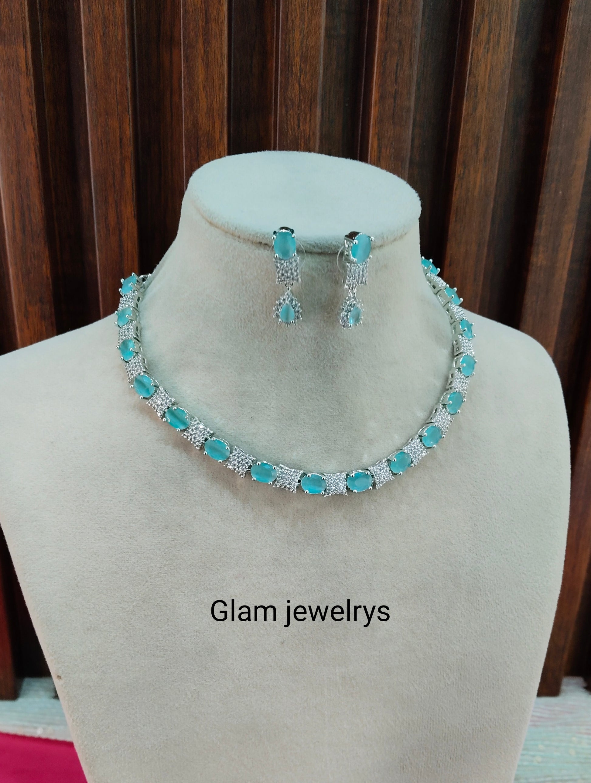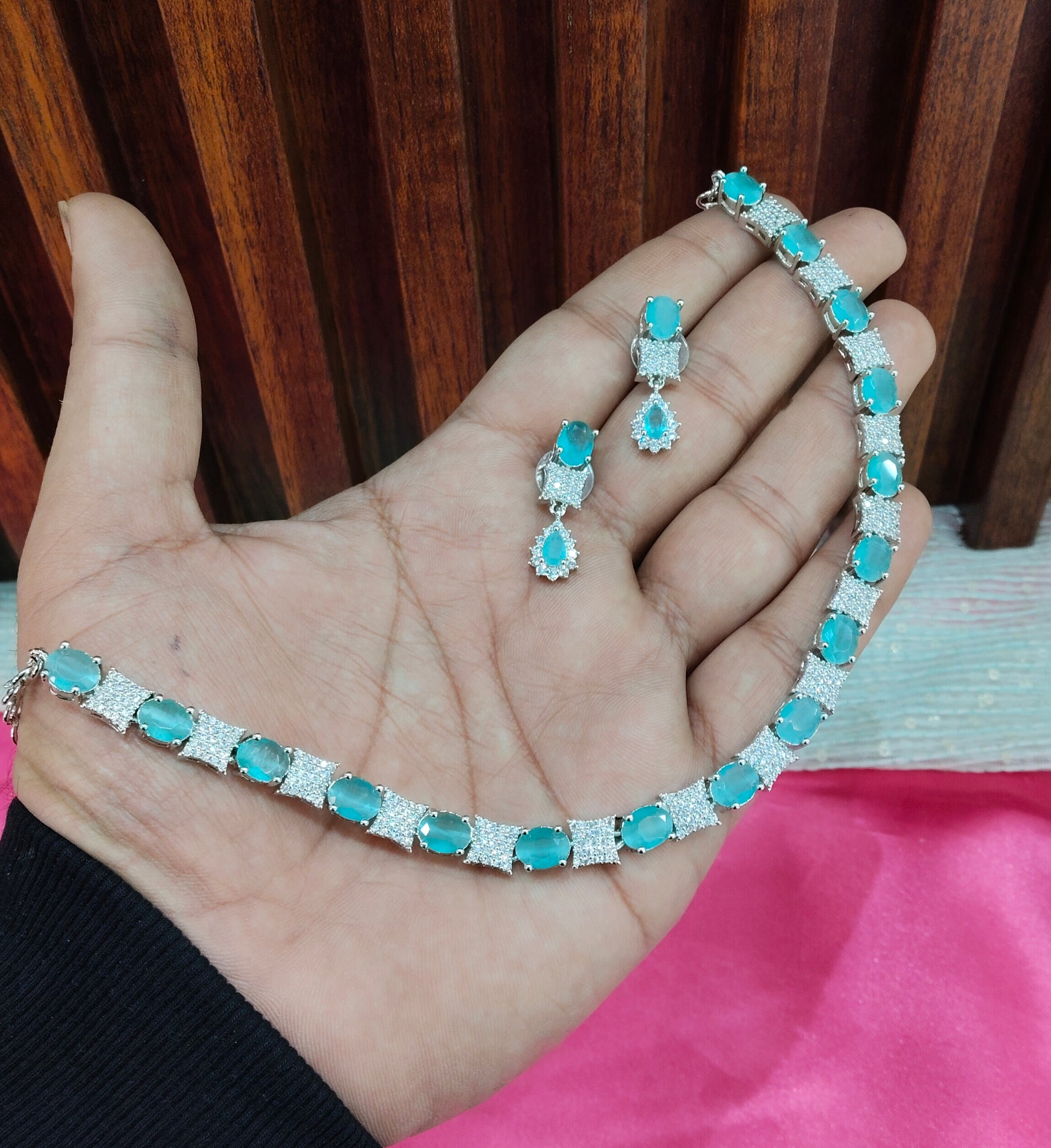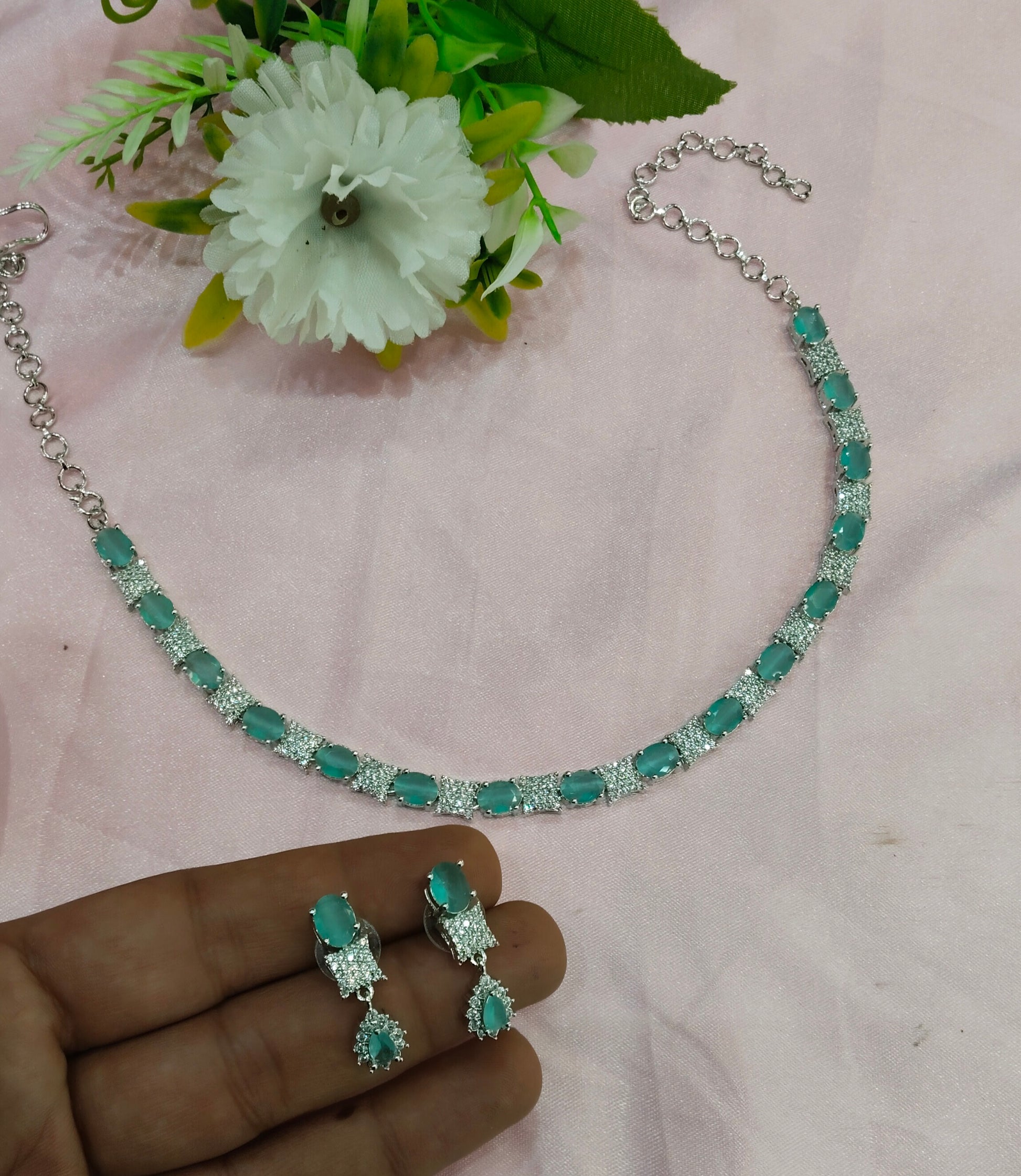 Sea Green CZ Silver Necklace Indian Jewellery Moscow Set