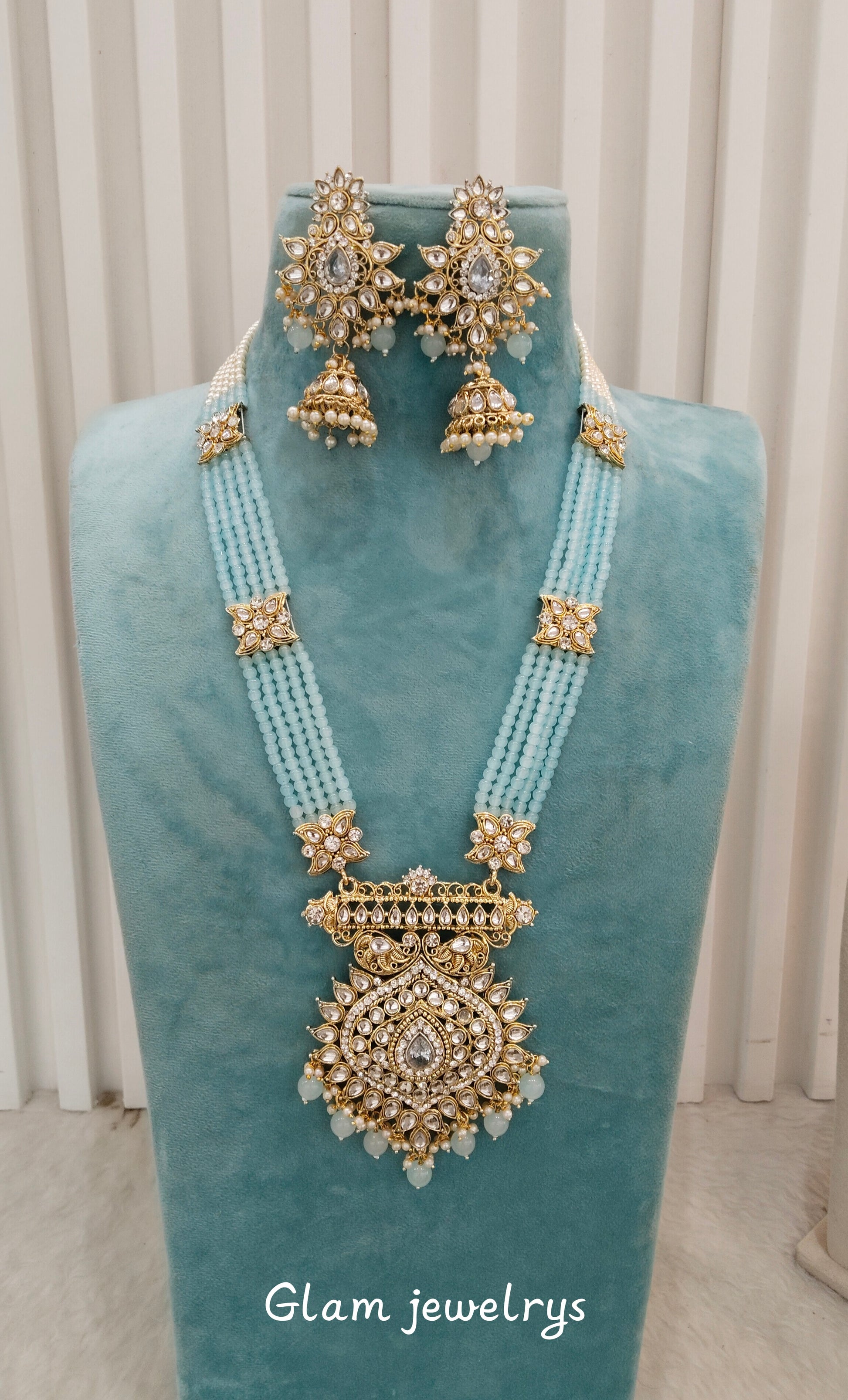 Sea Green Gold Kundan Long Rani Haar Necklace Indian Jewellery Set