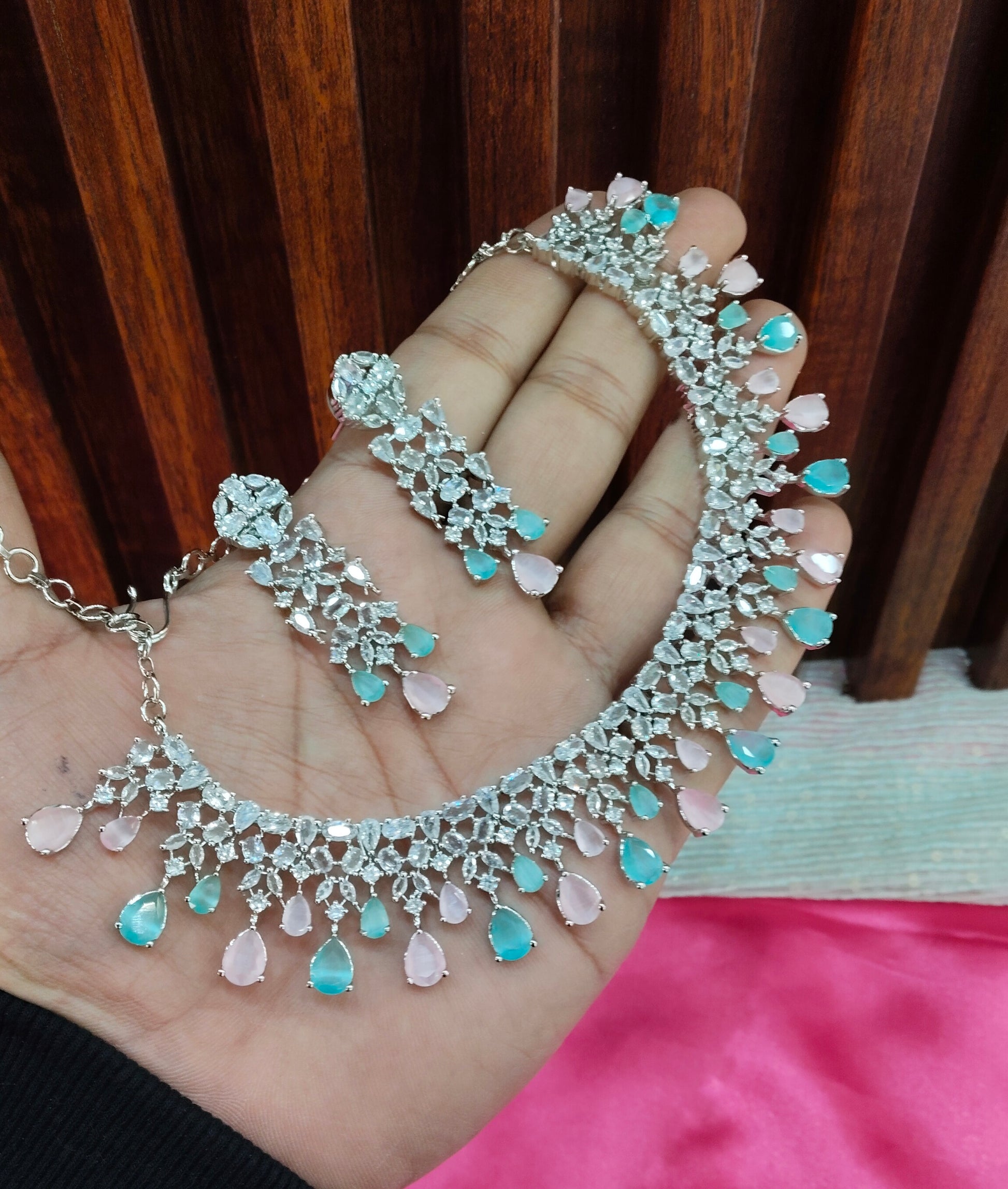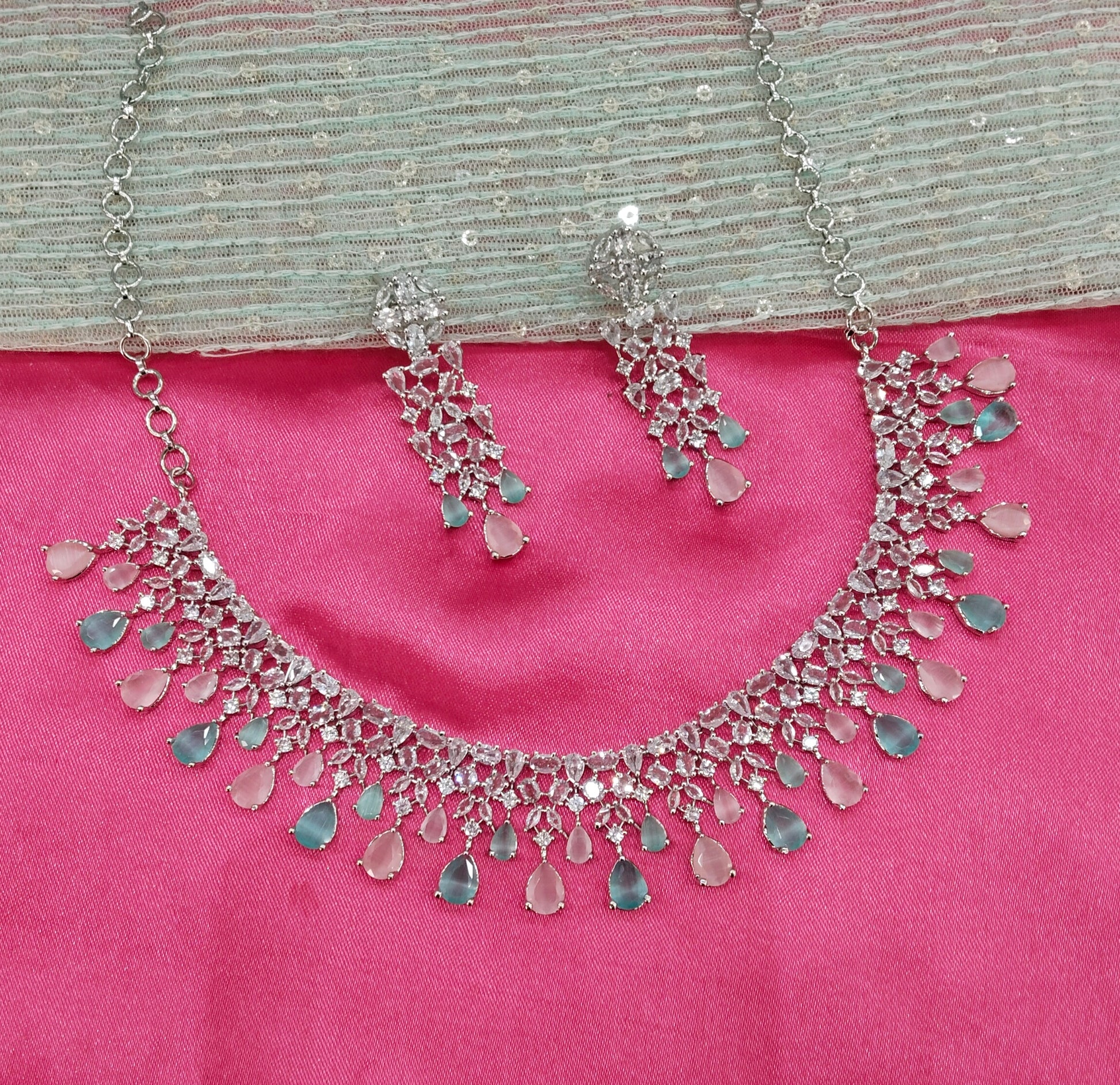 Sea Green Pink CZ Silver Necklace Indian Jewellery Auj Set