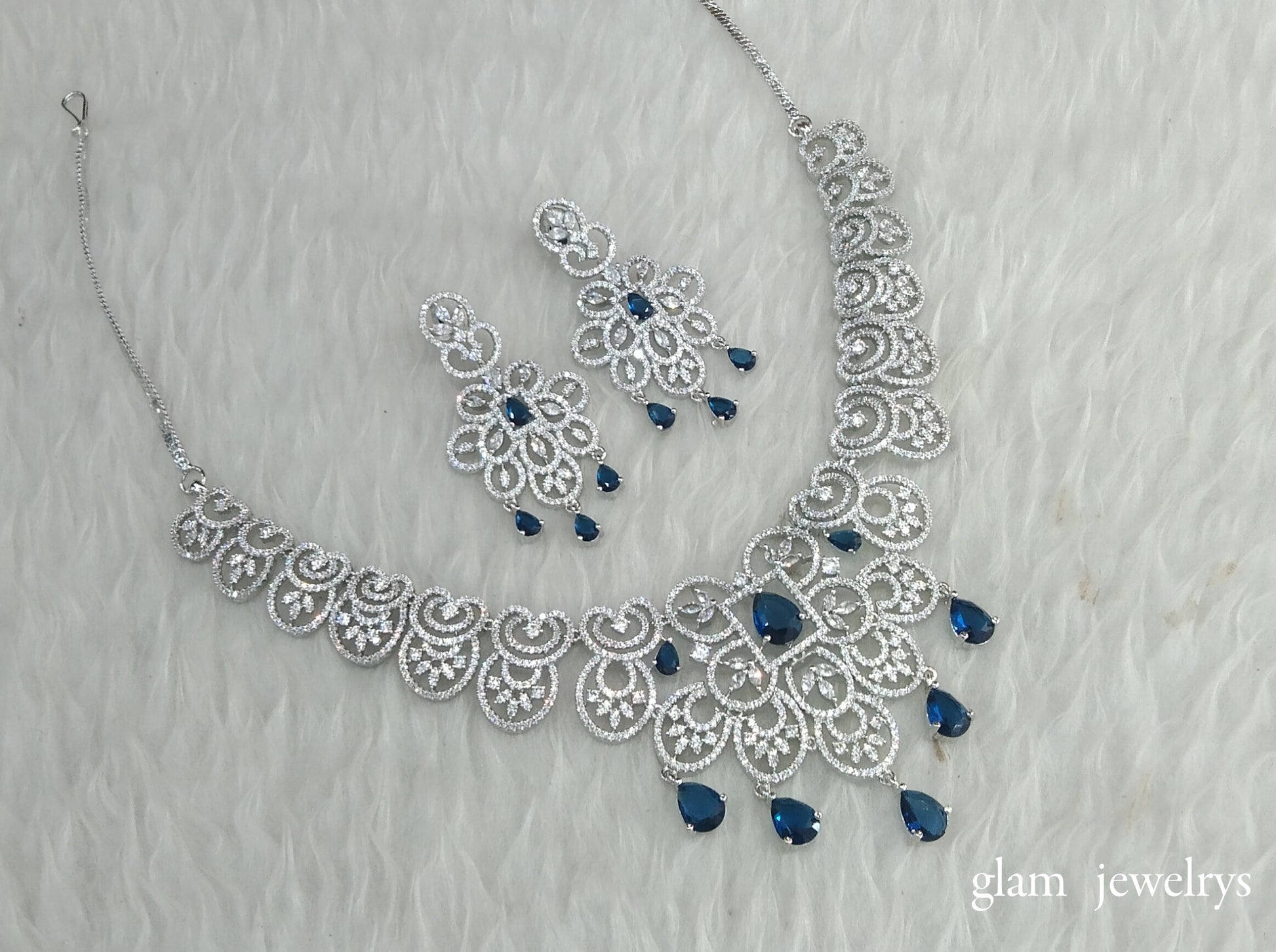 Silver Blue American Diamond AD Vera Necklace Set /Indian Necklace Set