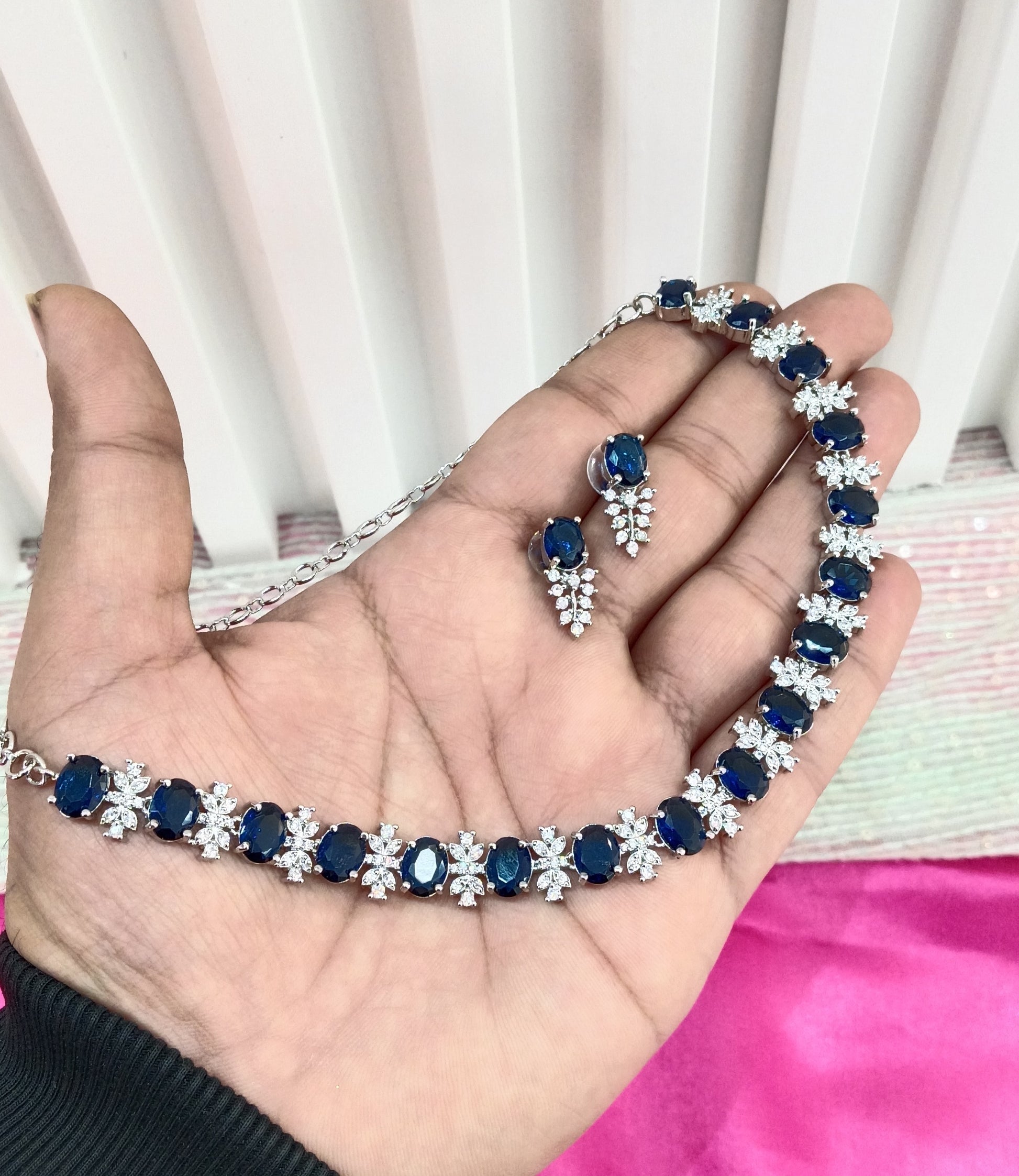 Silver Blue American Diamond CZ Necklace Aujla Set