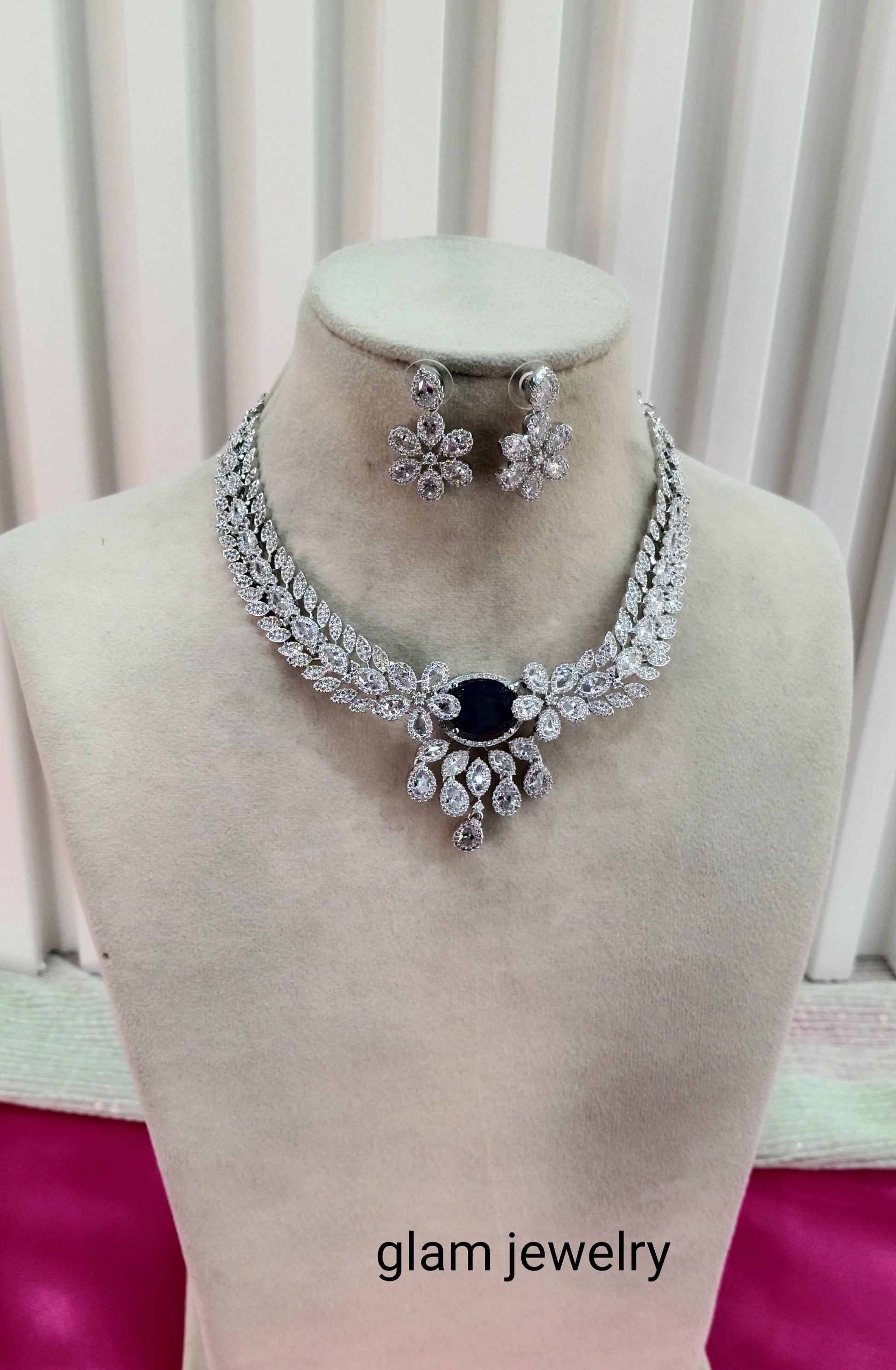 Silver Blue American Diamond CZ Necklace Daljit Set