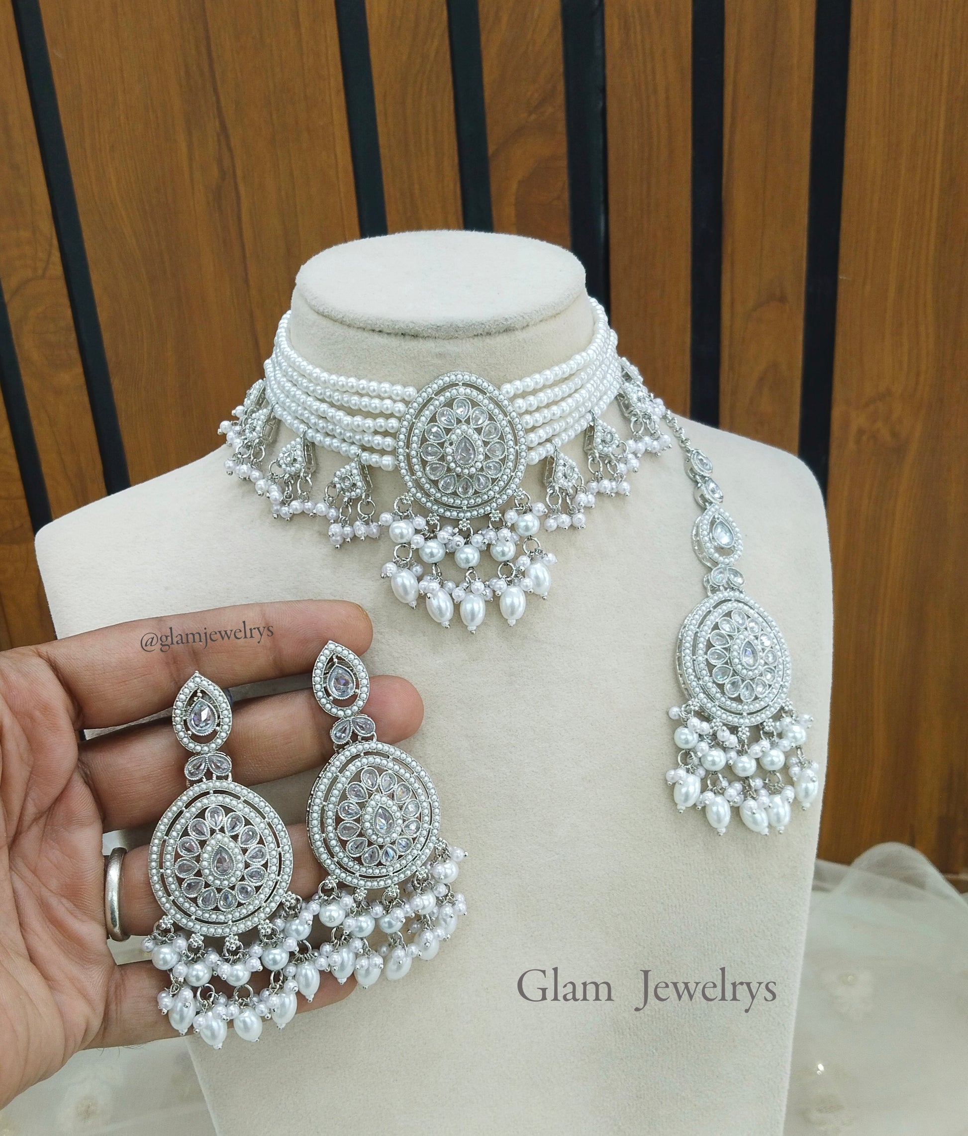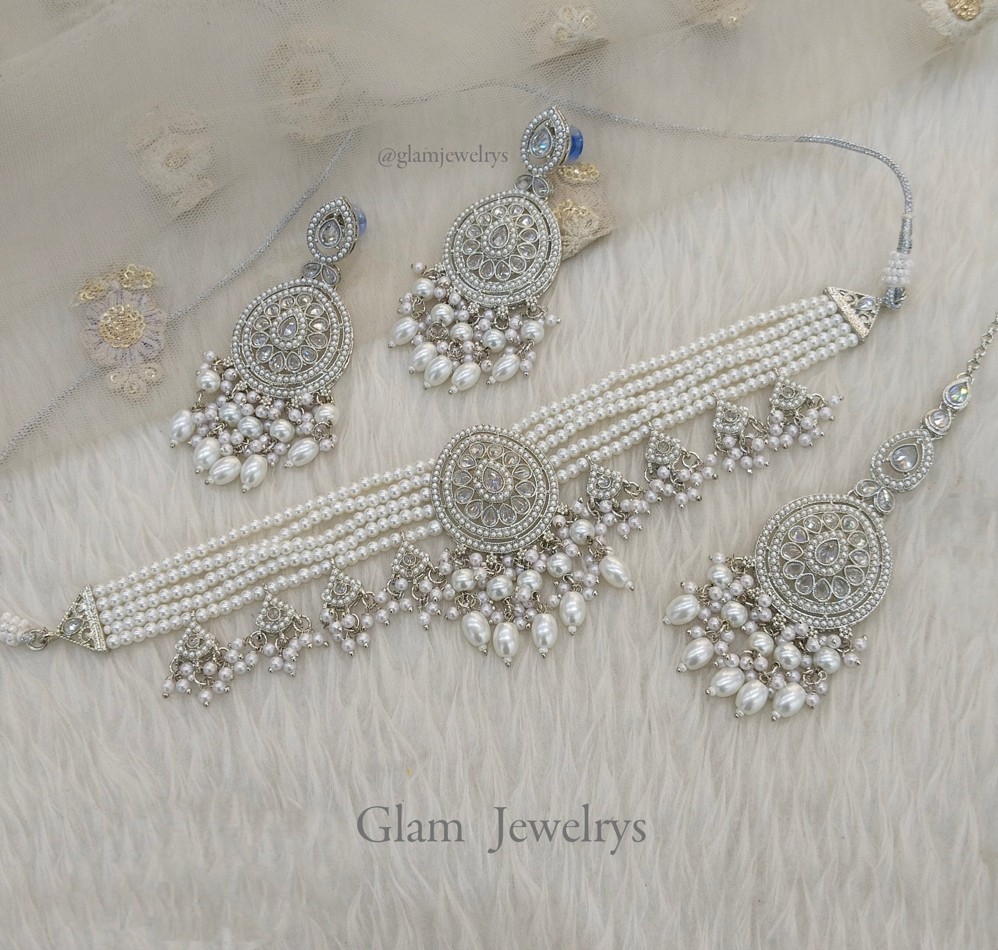 *Light weight silver choker necklace Set with earrings Tikka as shown in the pic.