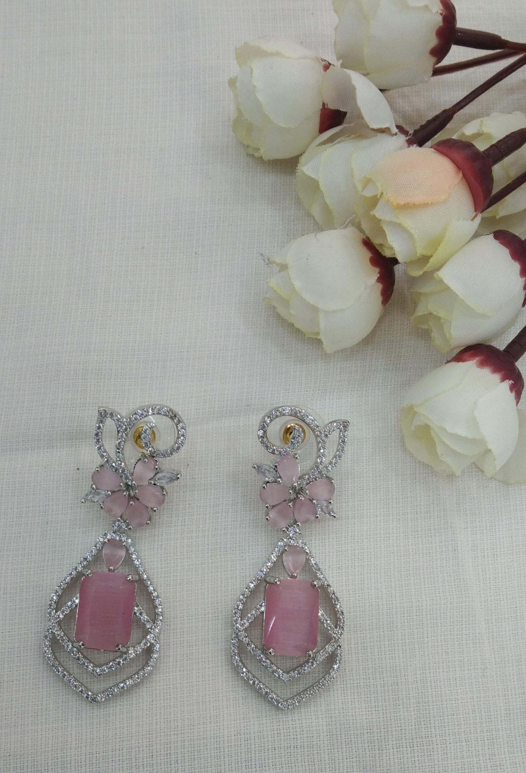 Silver Cubic Zirconia Diamond Kiran Earrings Pink