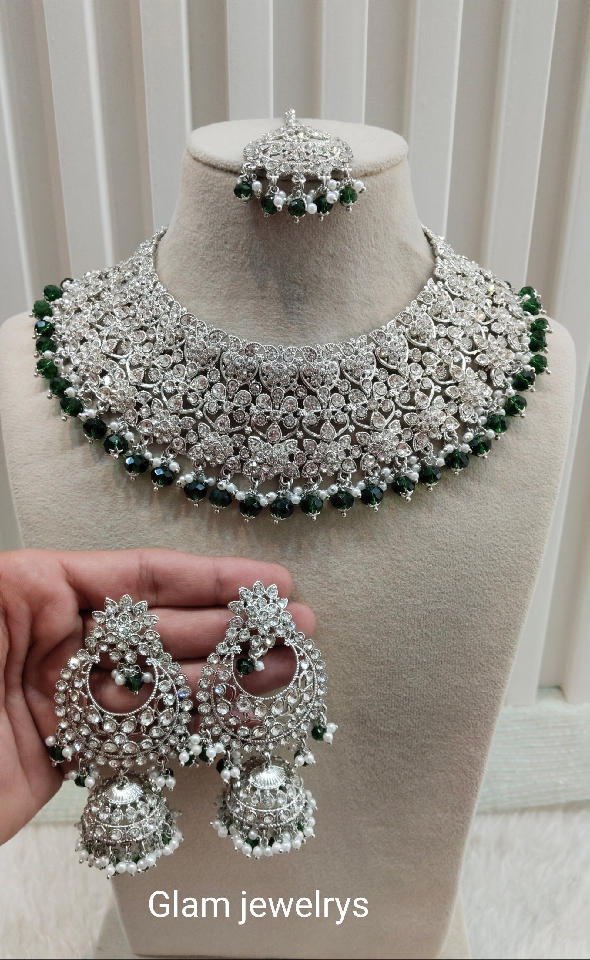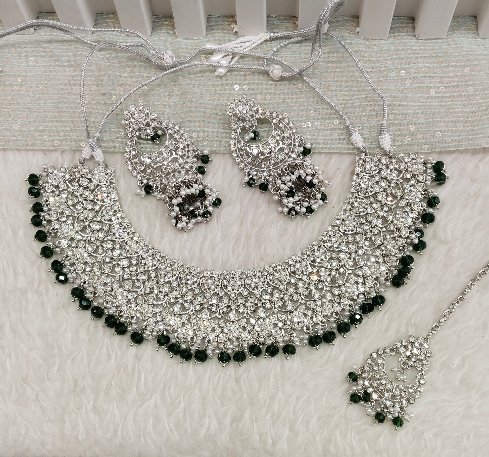 Silver Green Necklace Set Indian Bridal astin Jewellery