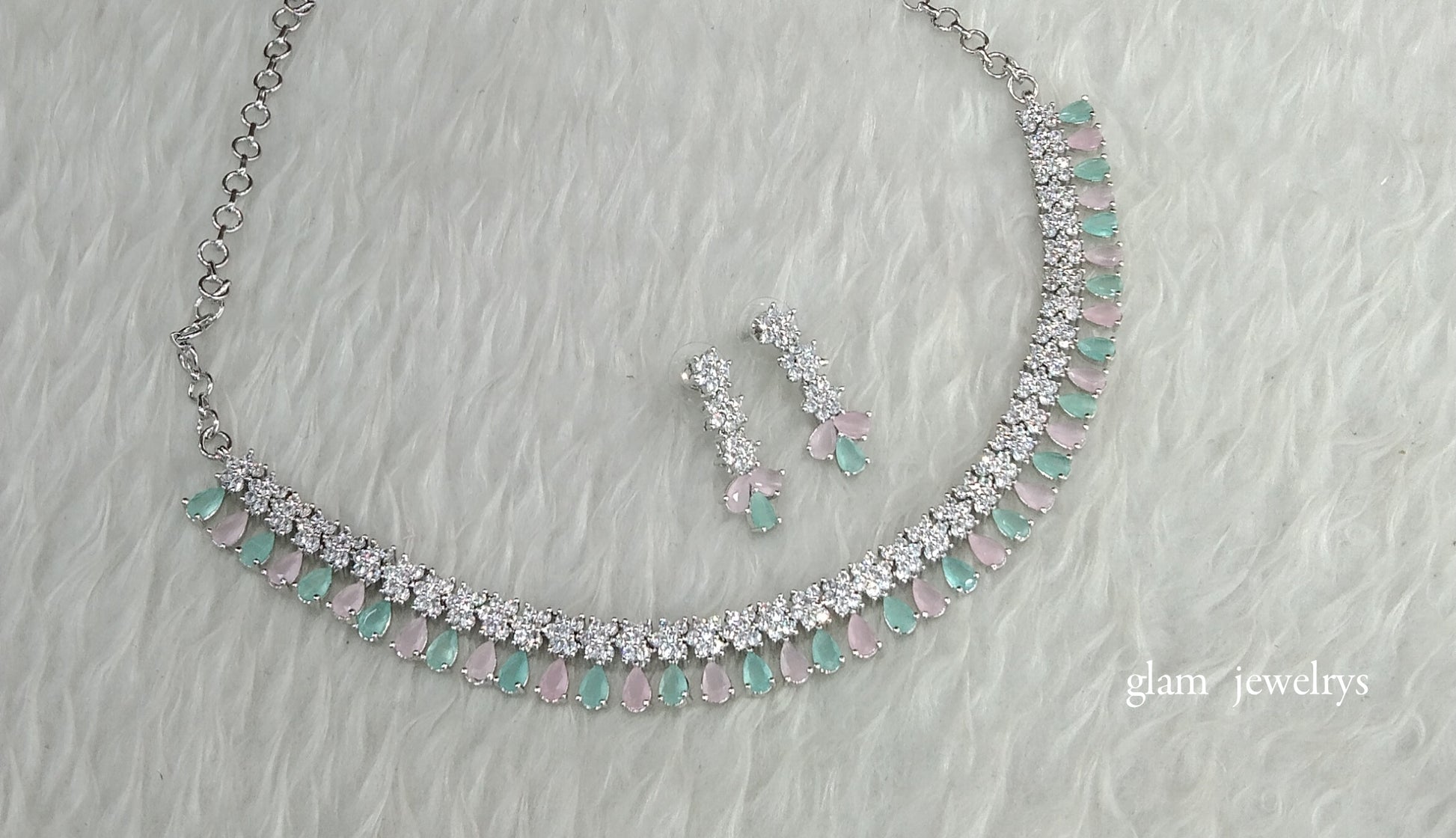Silver Mint Pink American Diamond AD Manat Necklace Set /Indian Necklace Set