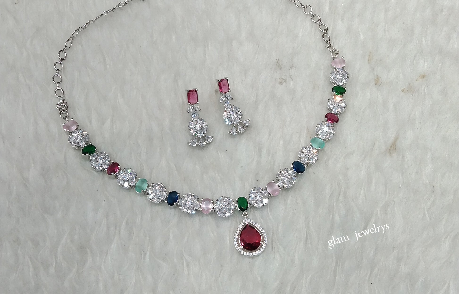 Silver Multi Color American Diamond AD Avery Necklace Set /Indian Necklace Sets