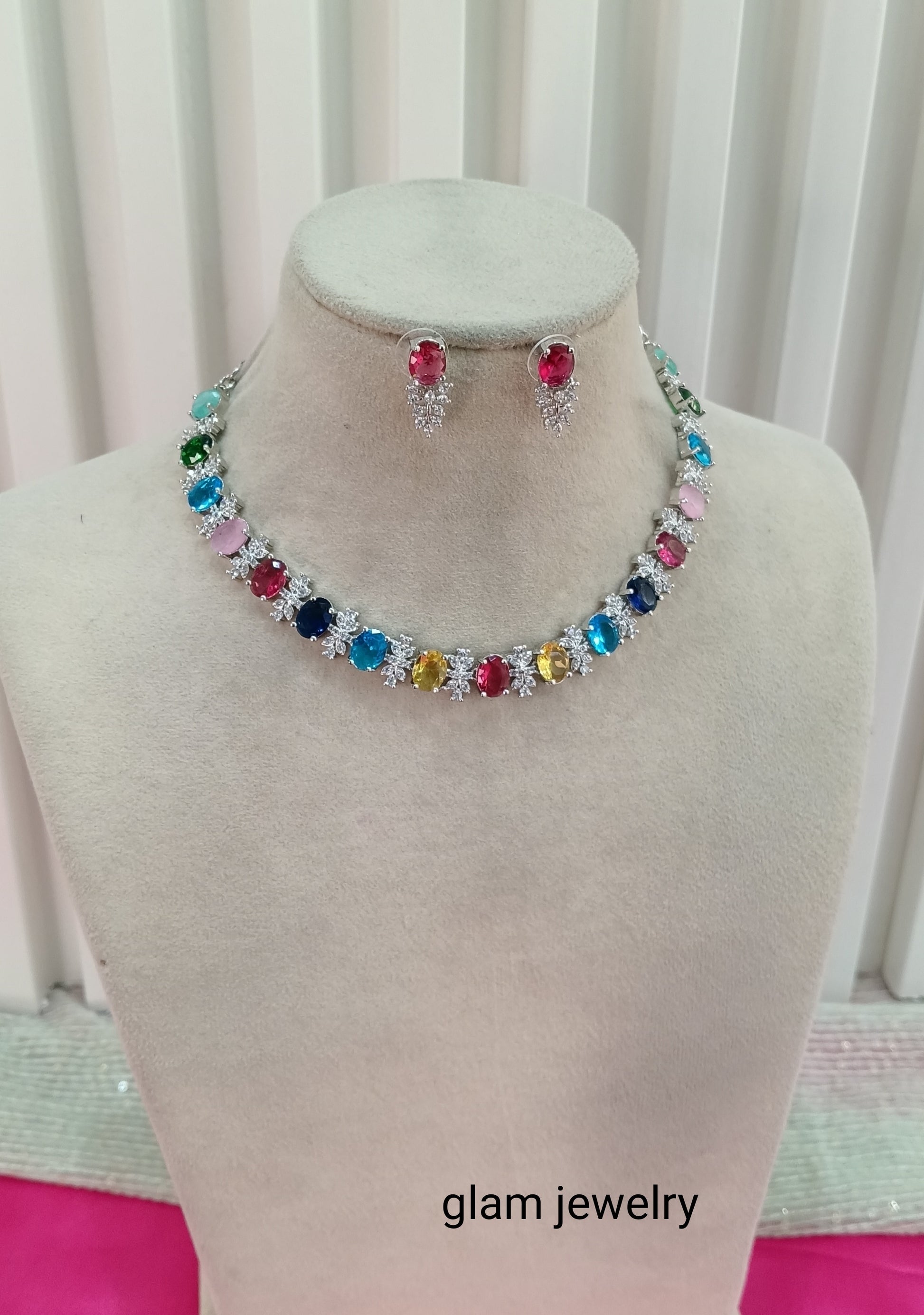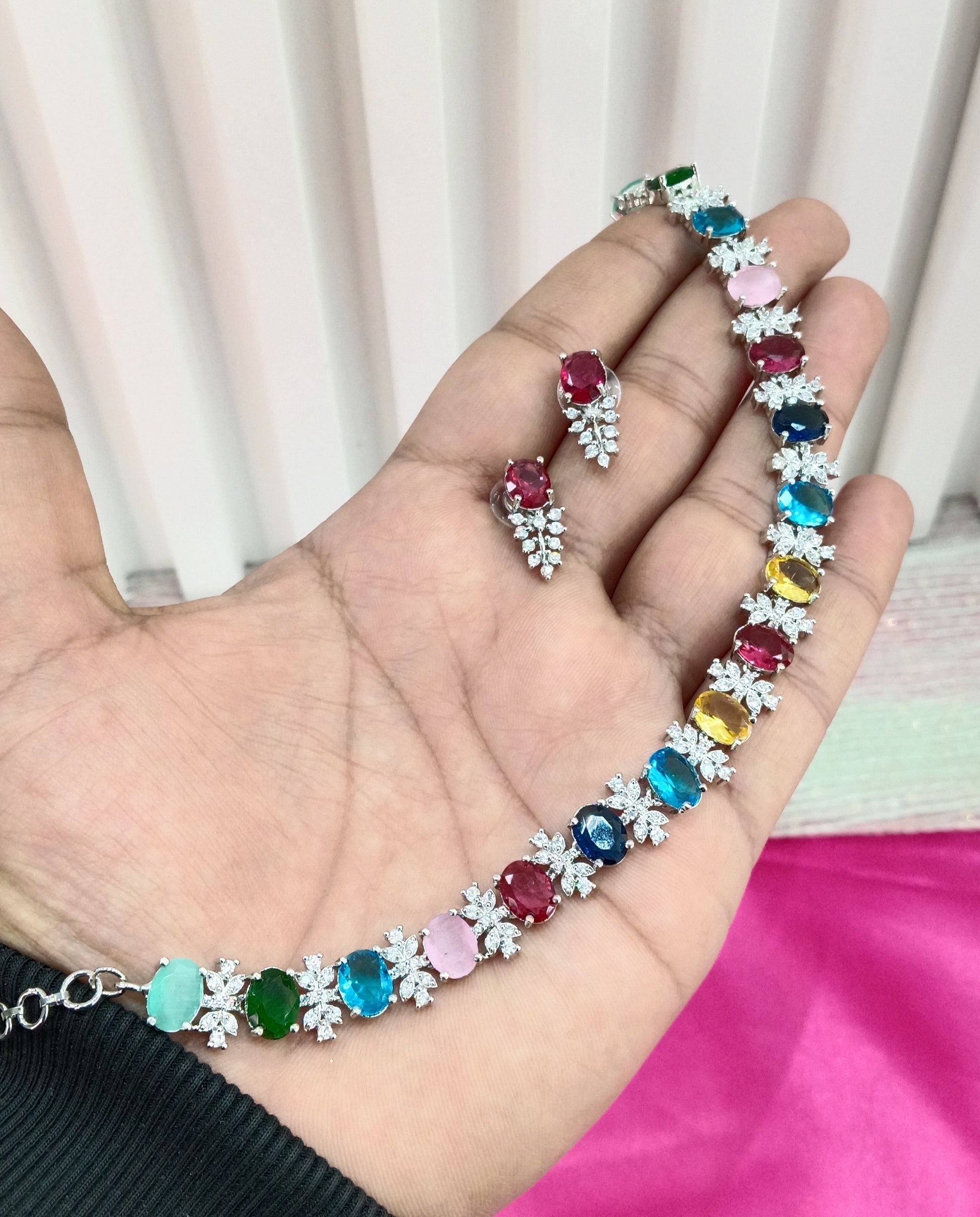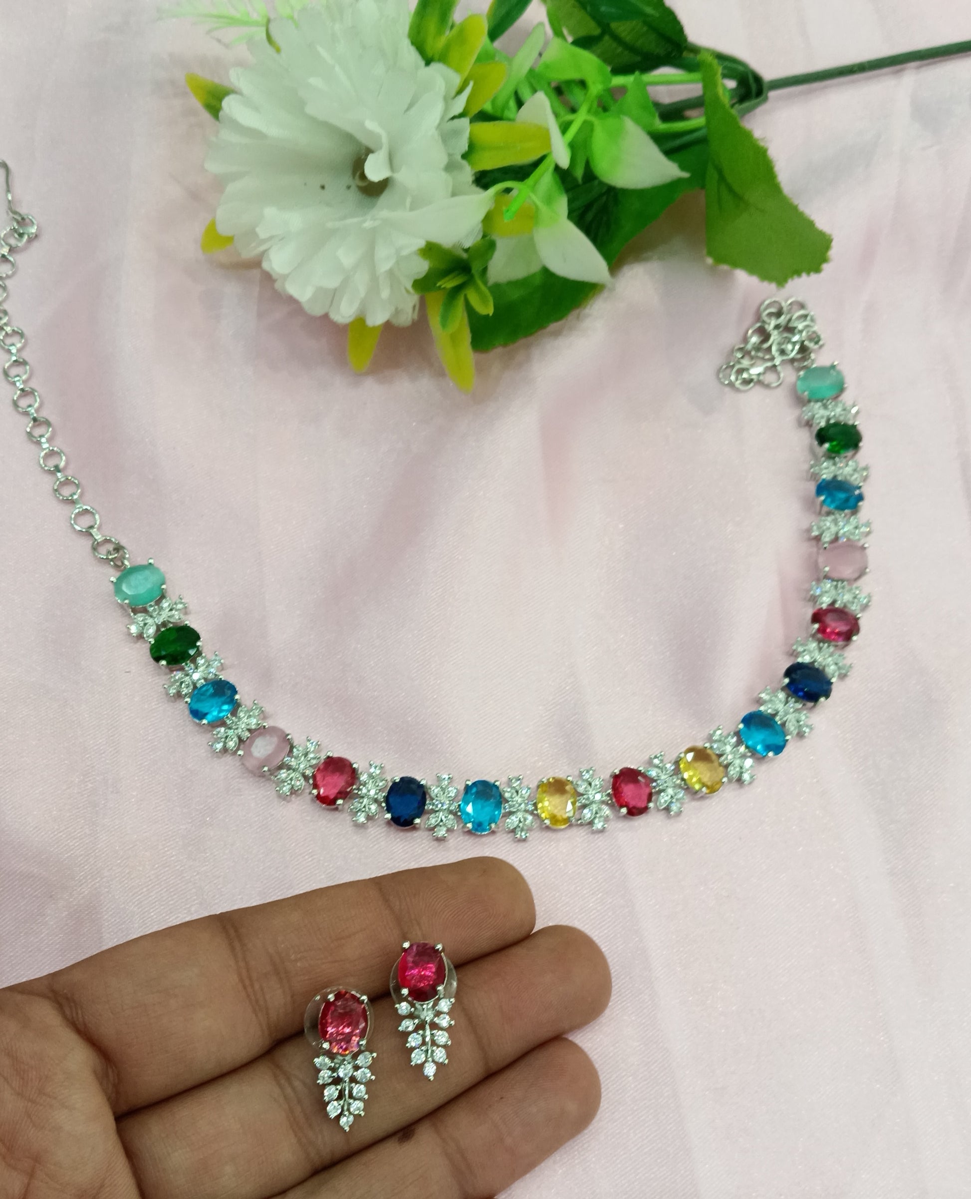 Silver Multi Colour American Diamond CZ Necklace Aujla Set
