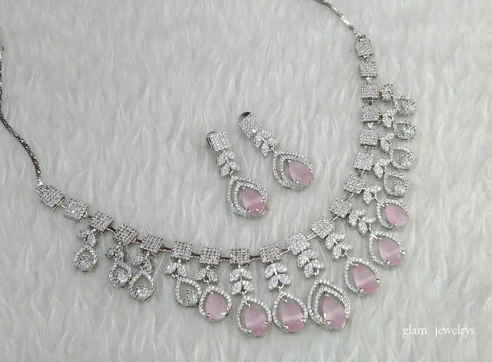 Silver Pink American Diamond AD Navjot Necklace Set /Indian Necklace Set