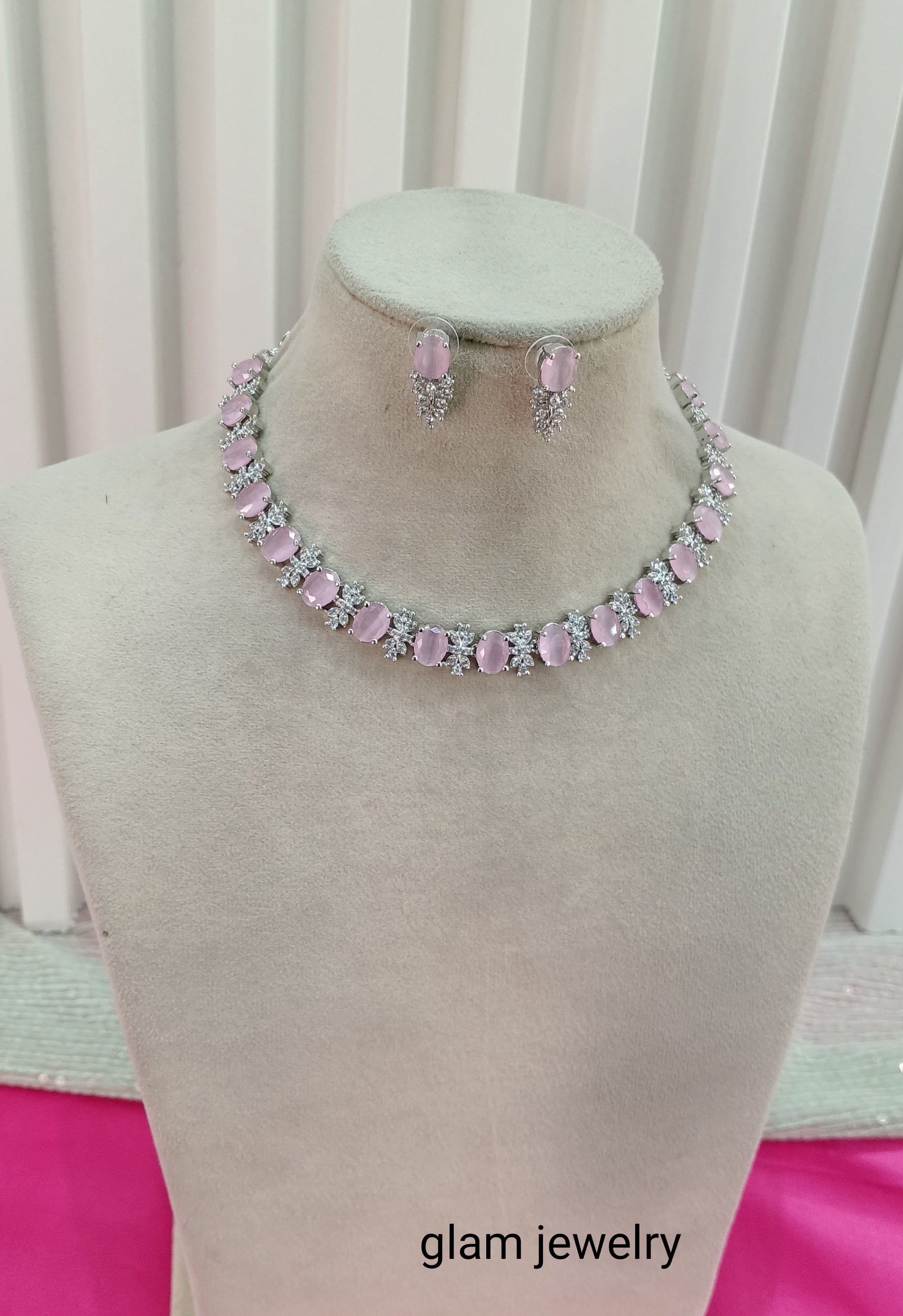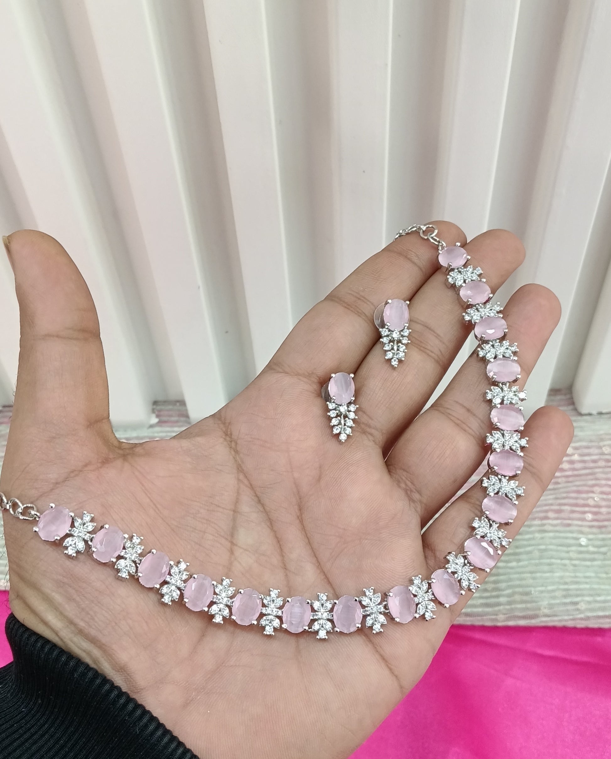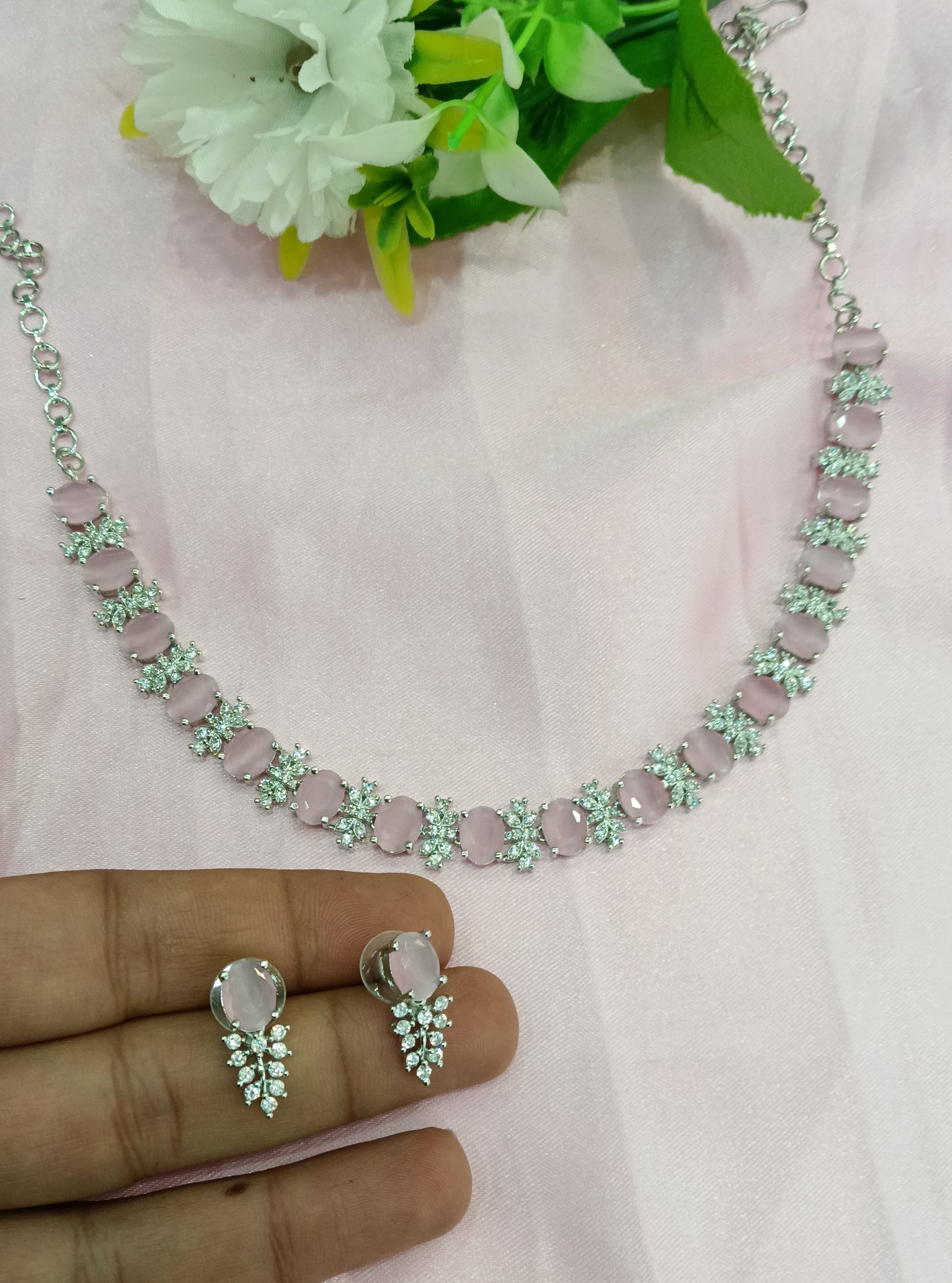 Silver Pink American Diamond CZ Necklace Aujla Set