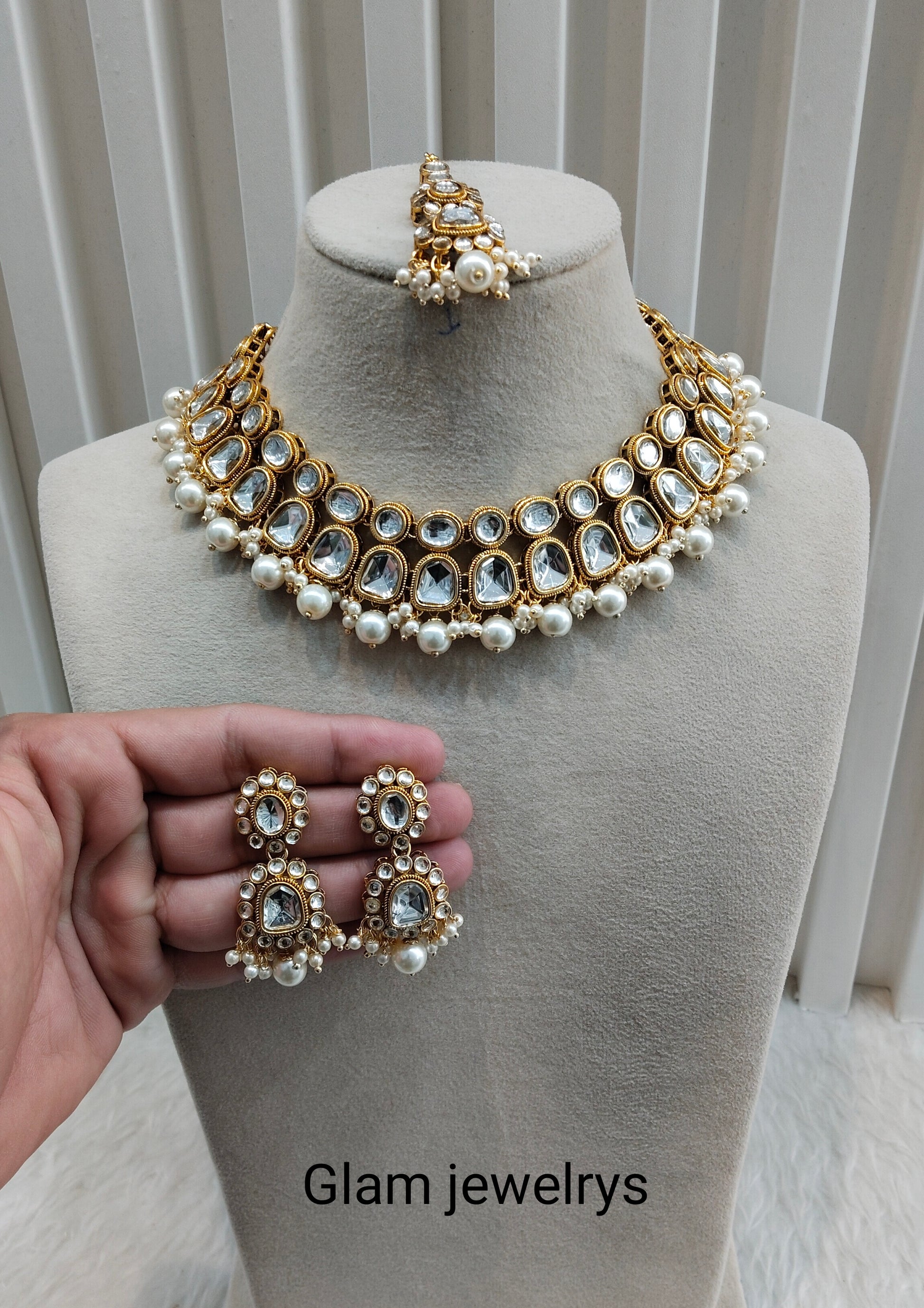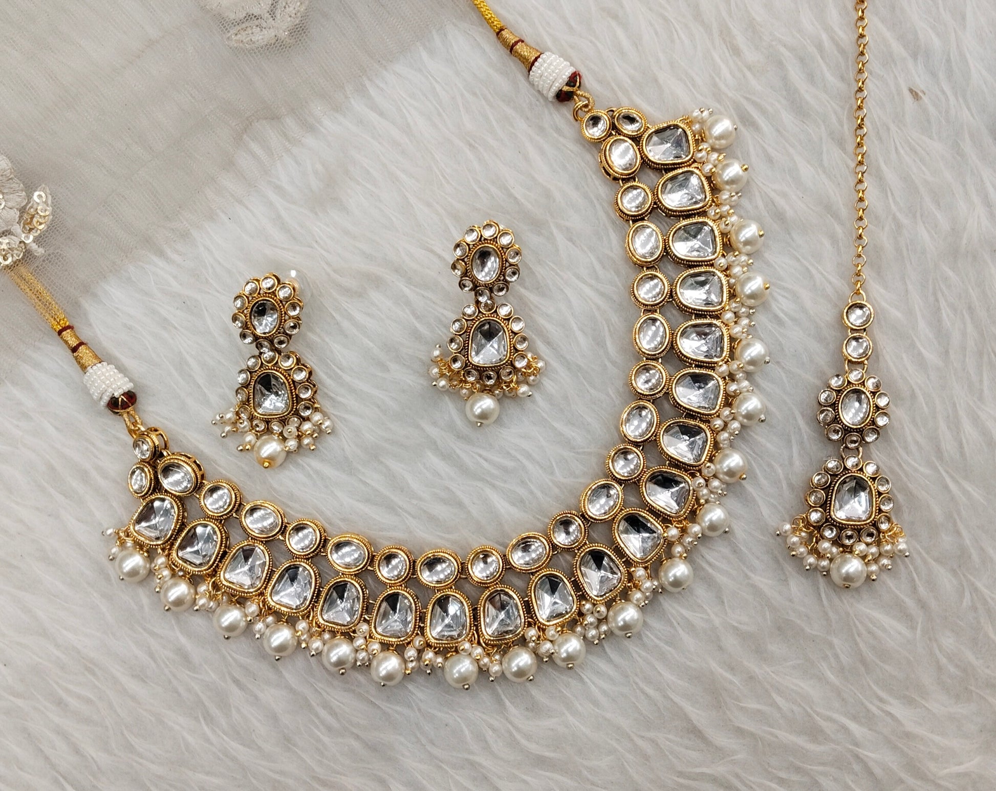 White Gold Kundan Necklace indian Jewellery Rishi Set